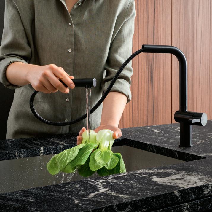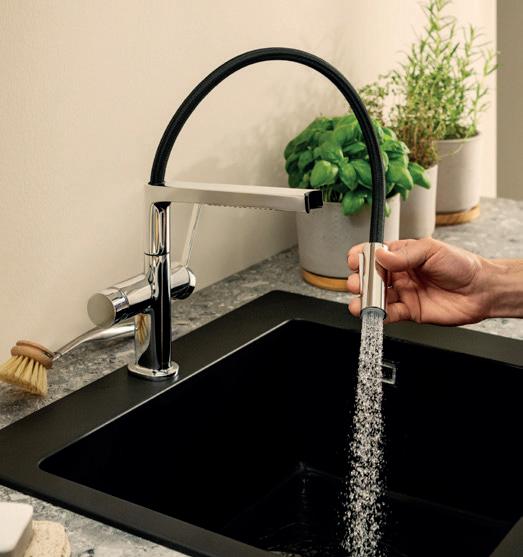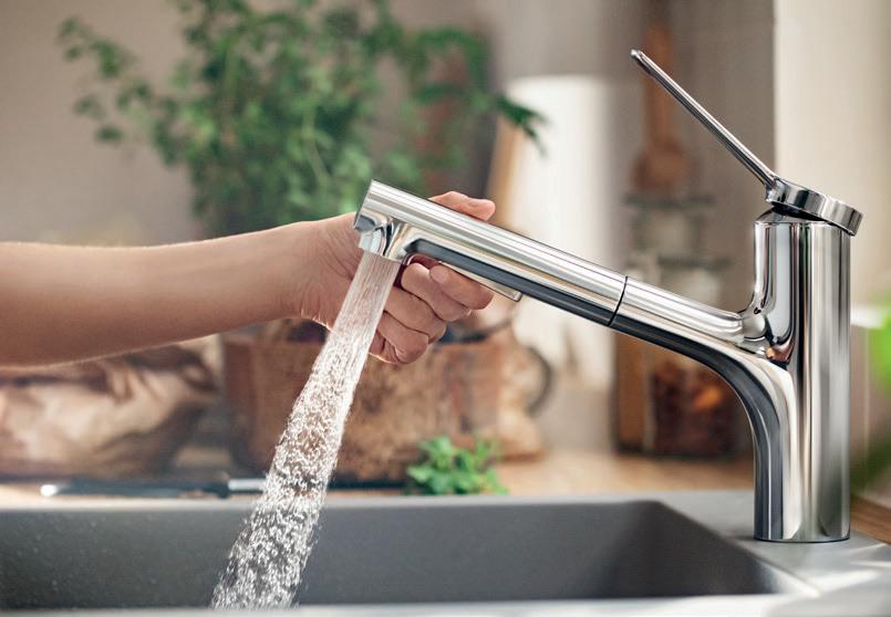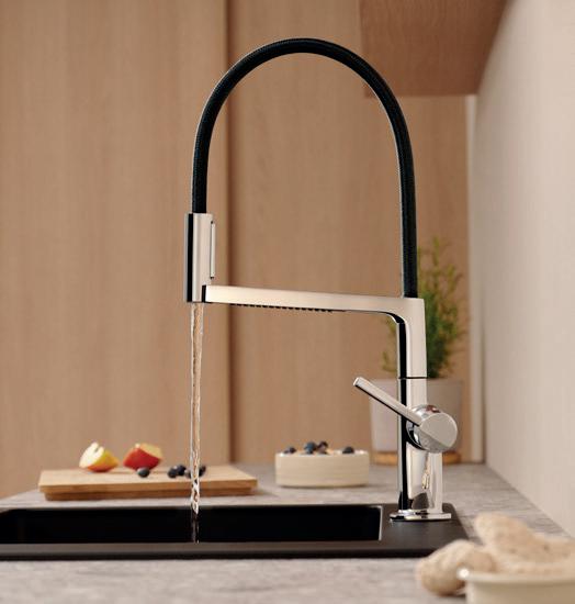 Con il nuovo rubinetto da cucina hansgrohe Talis Select M54 PowderSpray, hansgrohe porta aria nuova in cucina. L’elegante rubinetteria offre infatti la massima flessibilità grazie al tubo in tessuto di alta qualità realizzato in PET riciclato. Il pulsante Select consente di modificare facilmente i tre diversi tipi di getto.