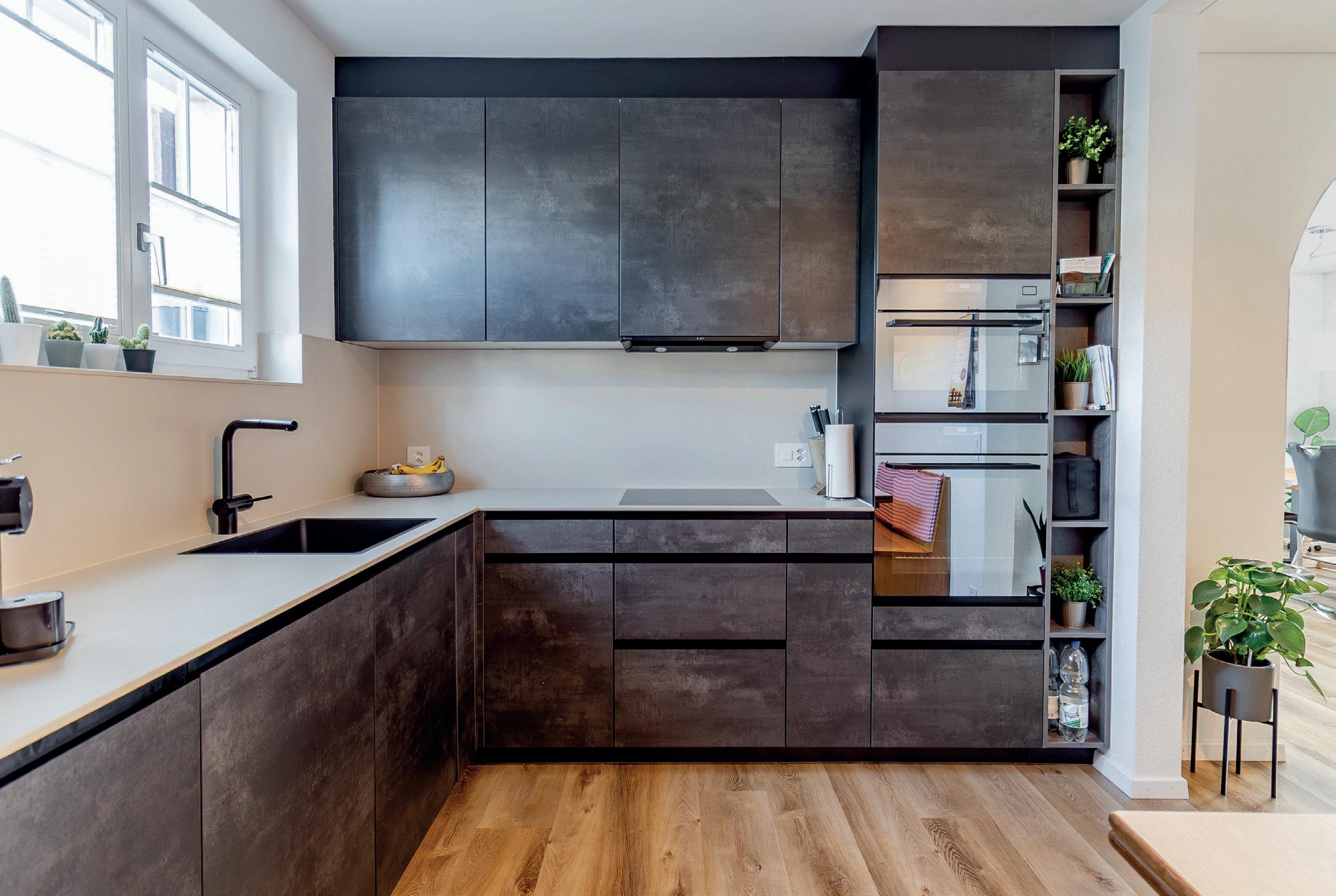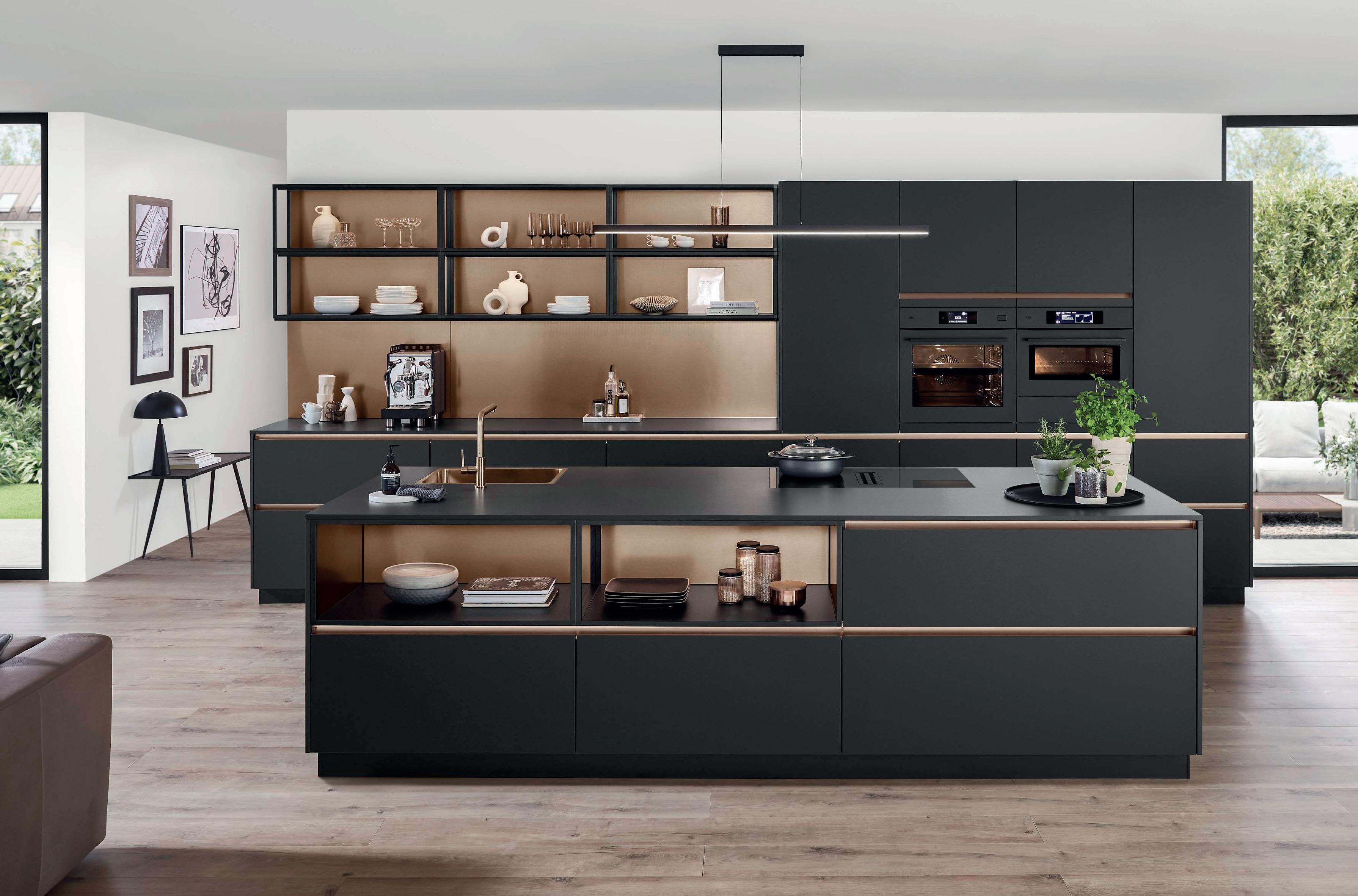 Il nero opaco e gli elementi color bronzo in questo caso formano l’accoppiata perfetta per un look moderno. Particolarmente bello è il riflesso metallico del collegamento tra il rivestimento della nicchia color bronzo e la parete posteriore degli scaffali Smartcube dell'isola. Il piano di lavoro e il rivestimento della nicchia effetto rovere creano un insieme armonico di tonalità naturali e una profondità materica interessante.