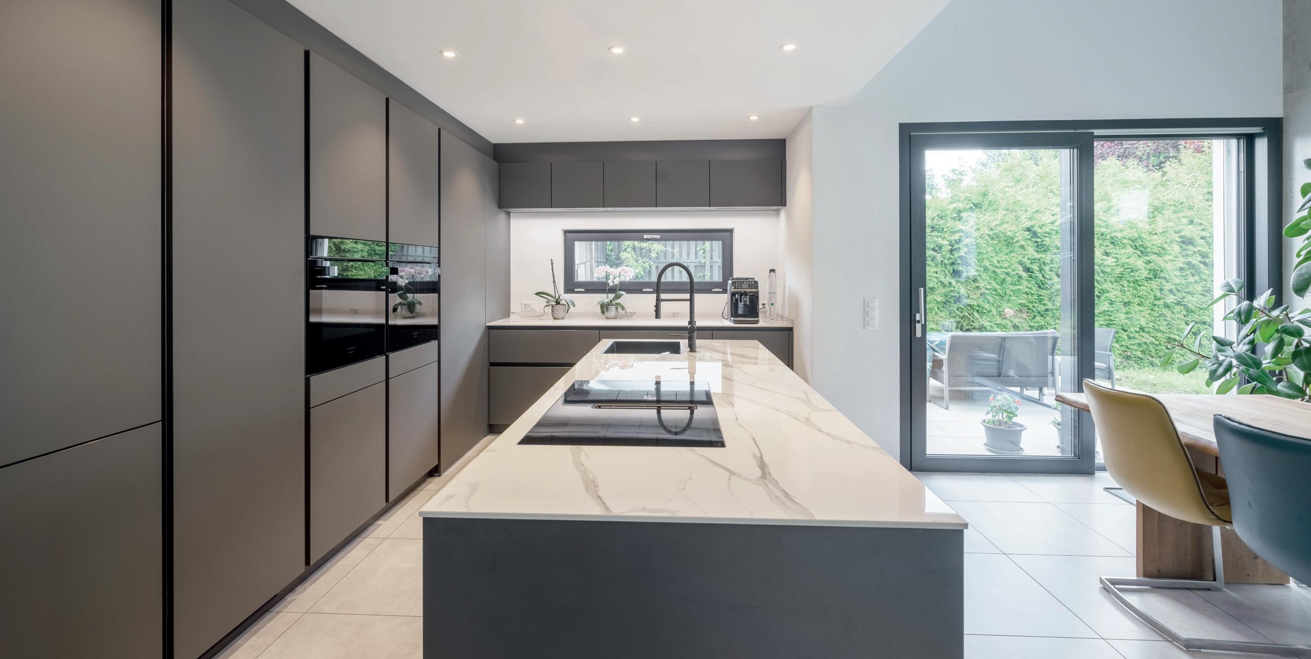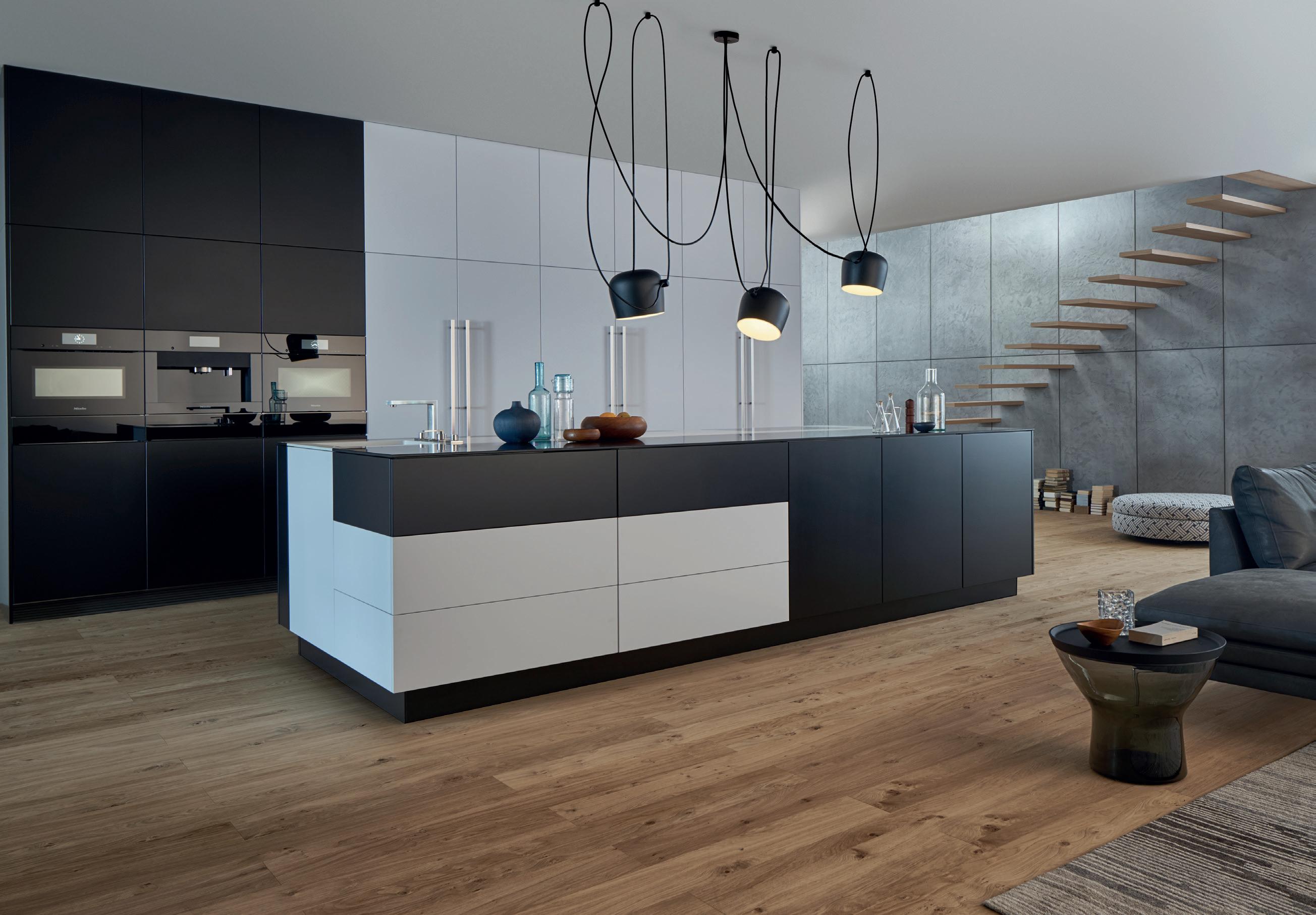 Il carattere di questa cucina è dato dal contrasto elegante e senza tempo tra il nero e il bianco. Per conferire un tocco leggero all'ampia isola monolitica, una fascia bianca traccia tutti i lati e mette in scena in modo dinamico le funzioni cottura e acqua. Un'altra caratteristica eccezionale: frontali in vernice opaca di alta qualità con effetto anti-impronta.