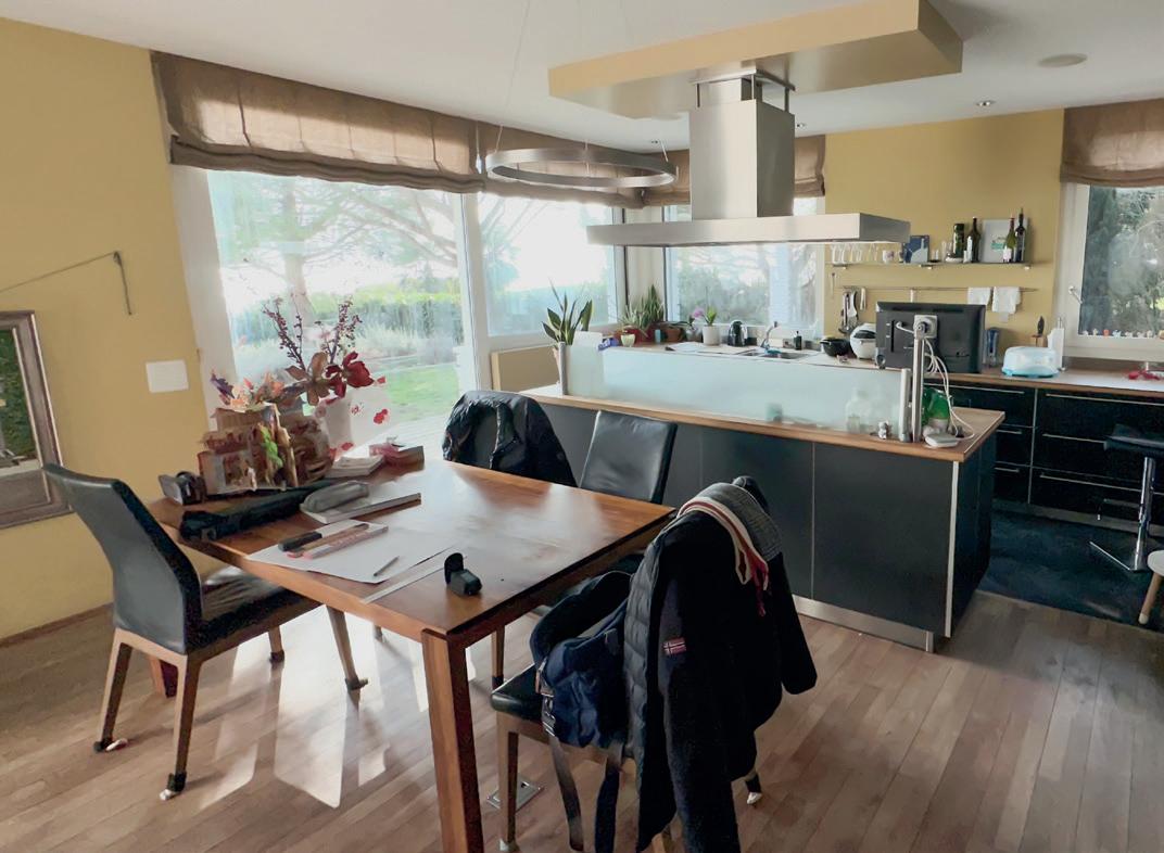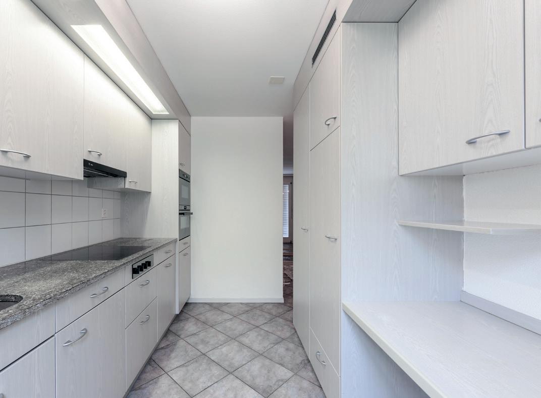 La cucina emana un'eleganza senza tempo. La parete di armadietti alti in noce dona calore e carattere, mentre le ante in vetro Vero catturano gli sguardi e creano un'atmosfera moderna e ariosa. Questa combinazione di colori e materiali dà vita a un ambiente elegante e accogliente.
