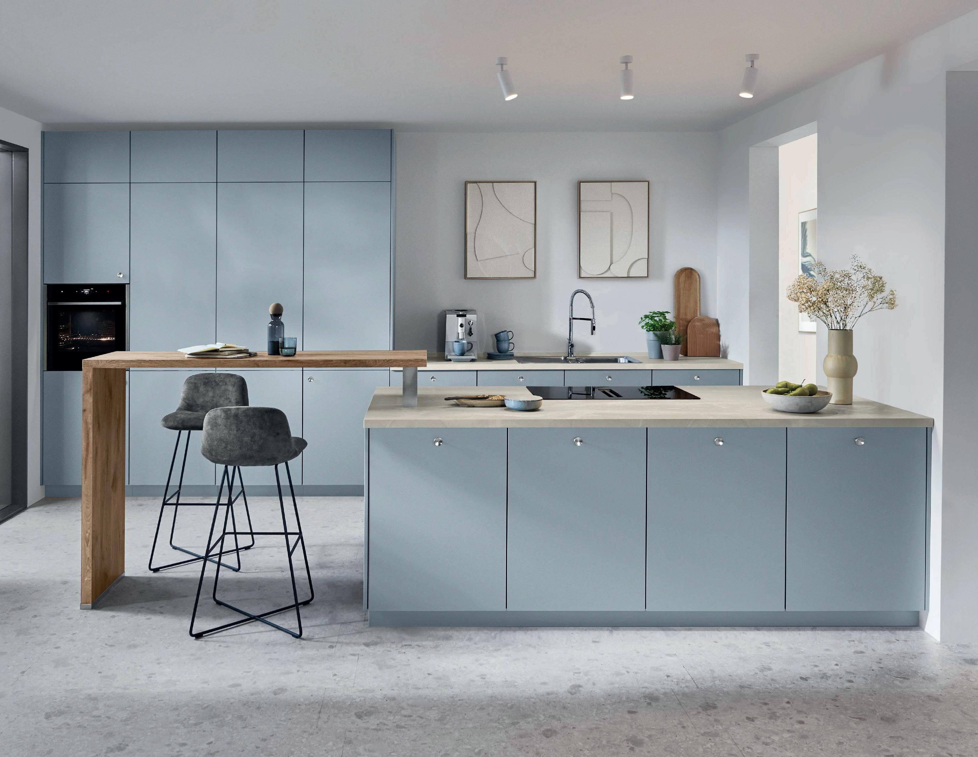Poco posto, ma tanto spazio per le idee. La delicata tonalità pastello Sky crea un'atmosfera chiara e ordinata a livello visivo grazie alla colorazione tono su tono. Tipico del design urbano delle cucine: funzionalità ed estetica diventano una cosa sola. Sia le porte di passaggio che il locale di servizio adiacente sono stati abilmente integrati nel design della cucina.