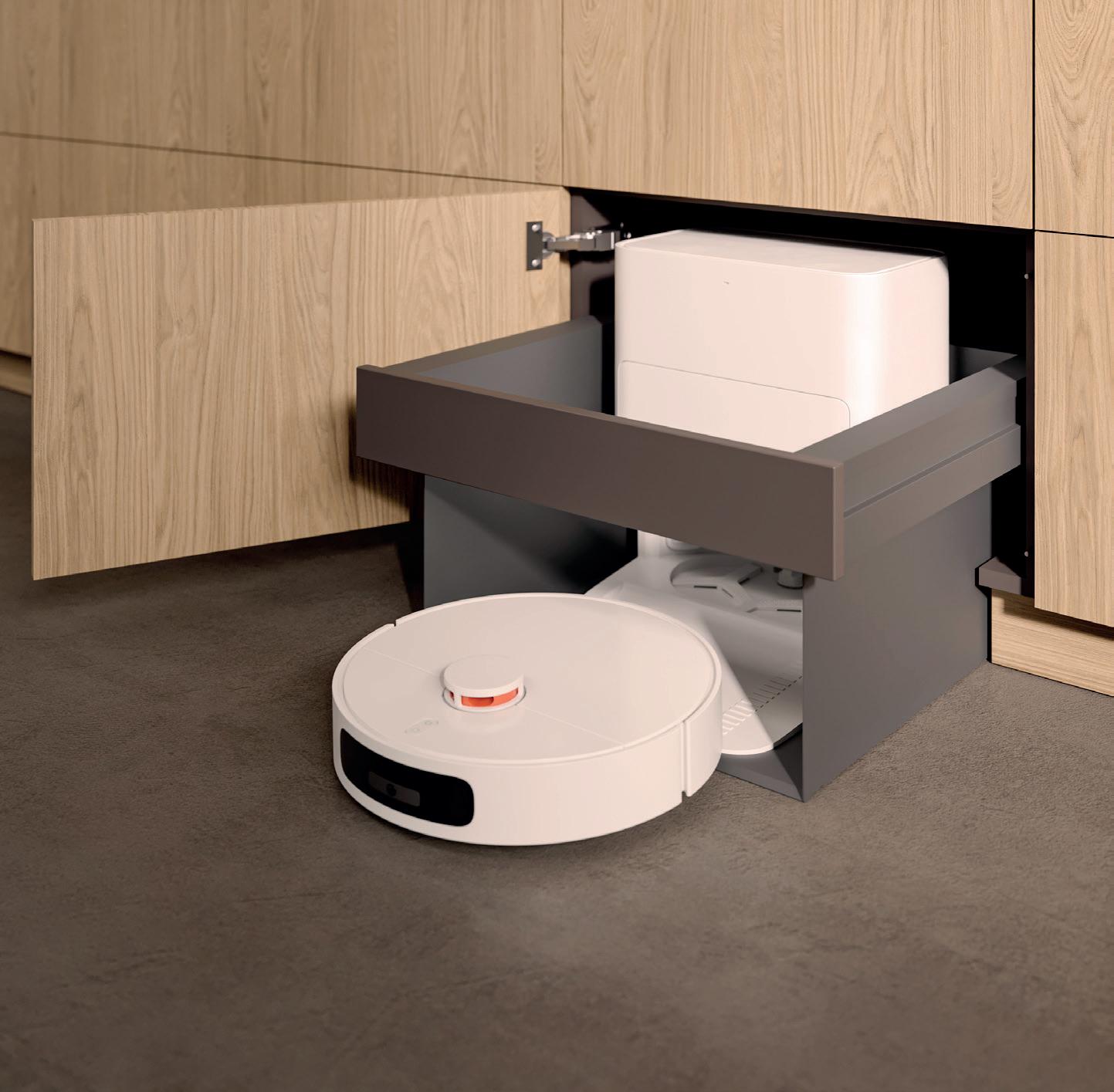 Spazio nascosto per il robot aspirapolvere e la stazione di ricarica. Pratico e a scomparsa. L’apertura nella base con vassoio di metallo permette un facile ingresso e uscita del robot aspirapolvere. La stazione di ricarica è sempre facilmente accessibile per la pulizia e le attività di manutenzione. Adatta a un'ampia varietà di aspirapolvere presenti sul mercato. Verificate in anticipo l'altezza necessaria e le dimensioni massime del dispositivo, inclusa la stazione di ricarica. Disponibile nei colori grigio carbonio e platino.