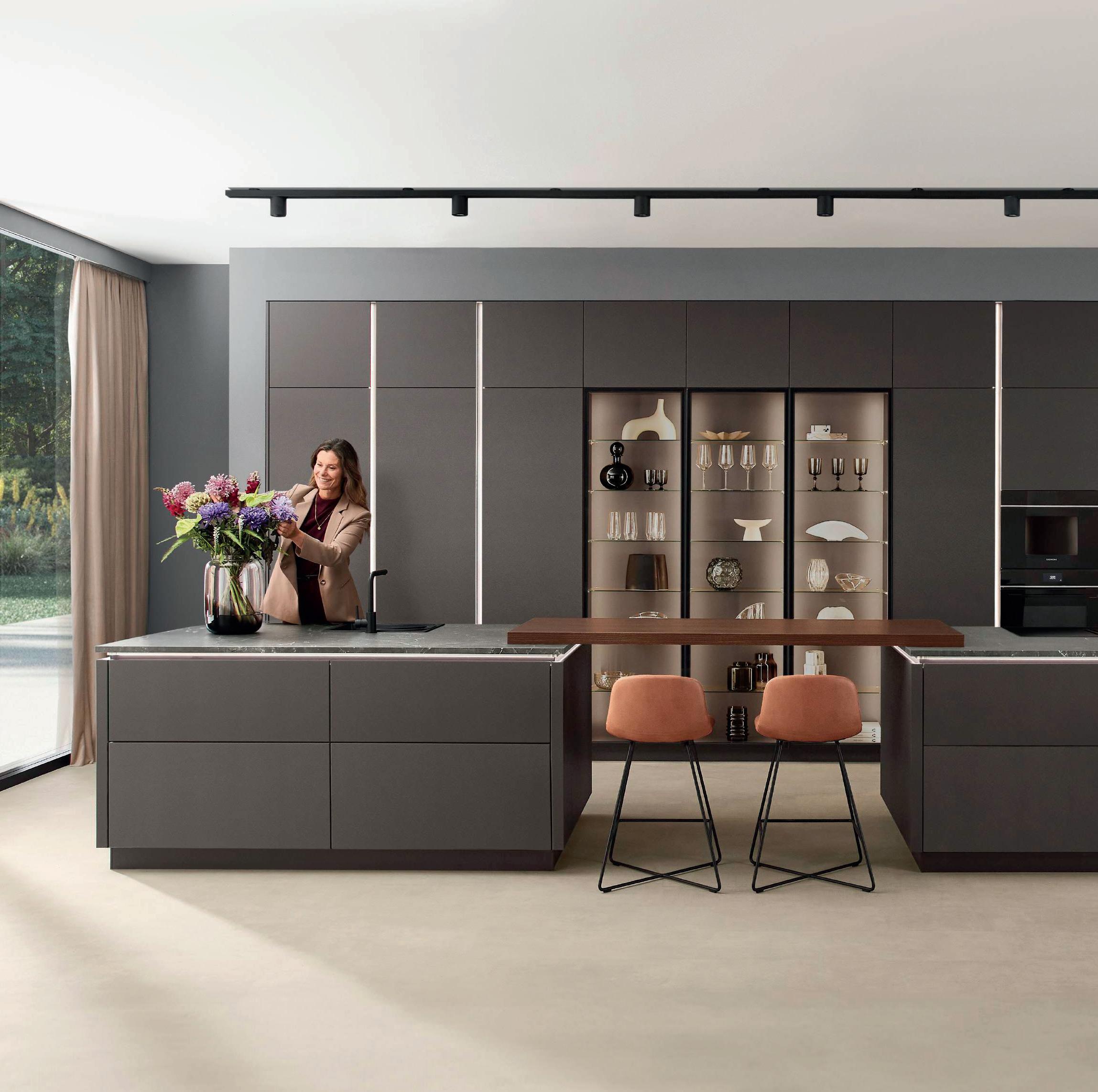 Questa cucina dà vita a un ambiente raffinato che vi invoglia a concludere la giornata in pieno relax. La tonalità Coffee è scura ed elegante e al contempo piacevolmente calda. L'ambiente ampio punta su un'estetica chiara e lineare e offre tanto spazio per cucinare. Le due isole e il bancone bar come elemento di collegamento costituiscono il cuore dello spazio: aperto, accogliente, pensato per chiacchierate e momenti condivisi.
