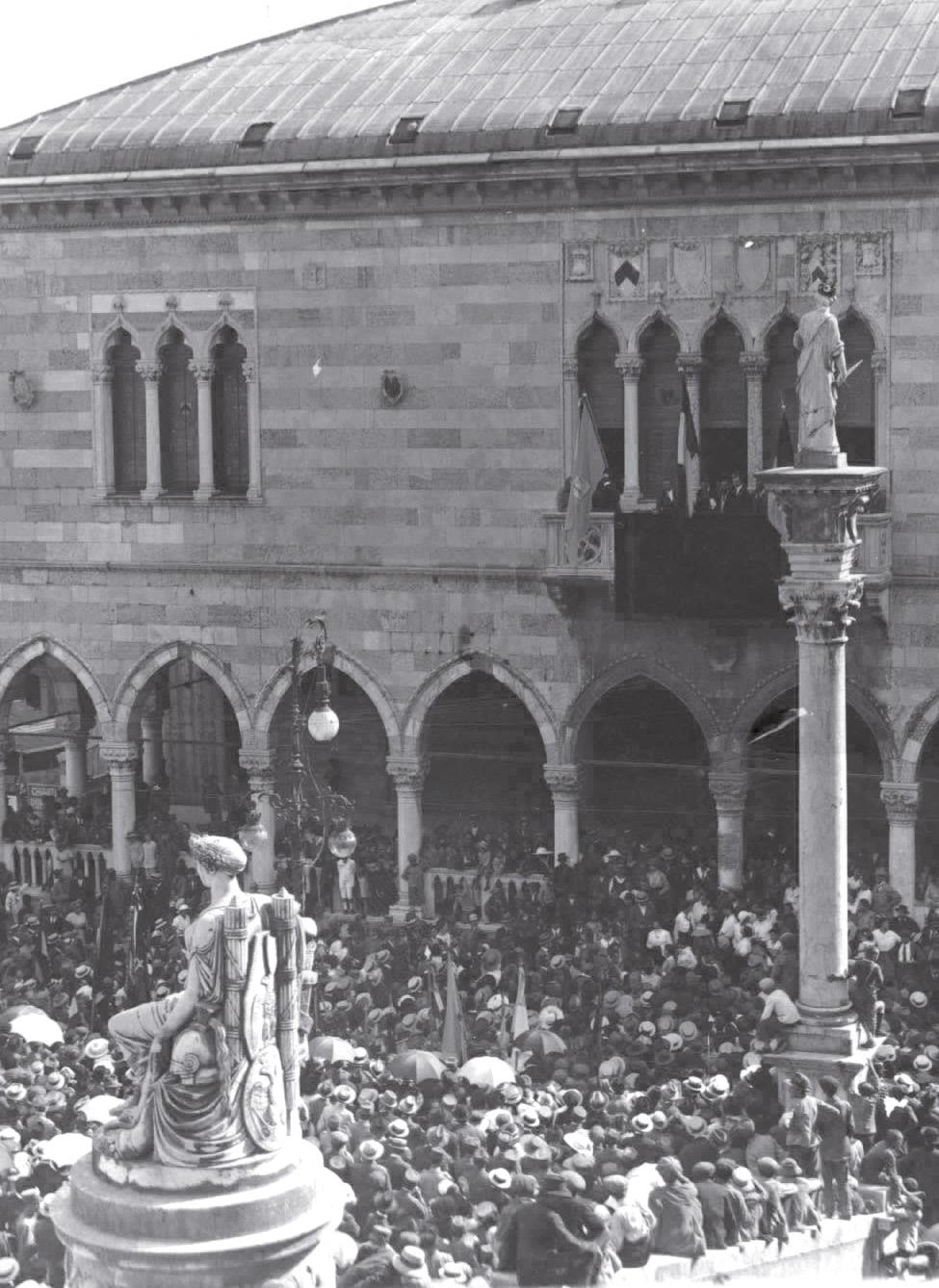 Nel primo dopoguerra tutti i paesi coinvolti nel conflitto organizzarono manifestazioni ed eressero una serie di monumenti per commemorare i propri caduti e, se vincitori, per celebrare l’esito della guerra. L’Italia non fece eccezione, e in tutti i comuni vennero eretti lapidi e monumenti dedicati ai caduti in guerra e alla vittoria. Questa pratica si diffuse anche nelle “nuove Province”, territori che avevano una valenza simbolica particolare, perché è per il loro possesso che l’Italia entrò in guerra, ed è in buona parte su di essi e nelle aree limitrofe che i soldati italiani combatterono e morirono a centinaia di migliaia. Pertanto, in queste terre la stessa presenza di monumenti dedicati ai caduti e alla vittoria vuole essere una forte riaffermazione di quest’ultima e dell’avvenuta annessione all’Italia, presentata come compimento dell’opera di unificazione nazionale risorgimentale. È per questo che nelle “terre redente” e nelle immediate vicinanze si eressero alcuni dei più grandi e maestosi monumenti d’Italia, come il Faro della Vittoria di Trieste, l’Ossario di Udine, e, in seguito, i sacrari di Redipuglia, Oslavia, Caporetto e Timau. Analogamente, il luogo scelto per l’avvio della più grande manifestazione del dopoguerra, la scelta della salma del “Milite Ignoto” e la sua partenza per il Vittoriano a Roma, fu la Basilica di Aquileia, simbolica culla ancestrale della cristianità e della latinità dell’area ormai interamente “redenta” grazie alla vittoria.