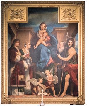 The Parish Church of San Martino al Tagliamento preserves important examples of 16th-century Friulian art. On the exterior wall stands a large fresco of Saint Christopher, painted by Il Pordenone around 1518, now faded but still impressive in scale. Inside are two fine altarpieces by Pomponio Amalteo, depicting Christ in Glory with Saints and a Madonna and Child flanked by Saints Another composition shows Saints Martin, Stephen, John the Baptist and George. These works reveal Amalteo’s full artistic maturity and his strong connection to Il Pordenone’s legacy.