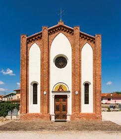 The construction of the first church dates back to the 7th century, while the present building was erected between 1880 and 1885 in Neoclassical style and embellished in the decades that followed. Inside, it preserves a copy of one of Il Pordenone’s most powerful works: the altarpiece of the high altar depicting the Madonna with Saints Hilary and Tatian, Anthony the Abbot and John the Baptist (1519 (?)–1521). The original work is housed in the Diocesan Museum of Sacred Art of Concordia-Pordenone. The baptismal font is the work of Pilacorte.