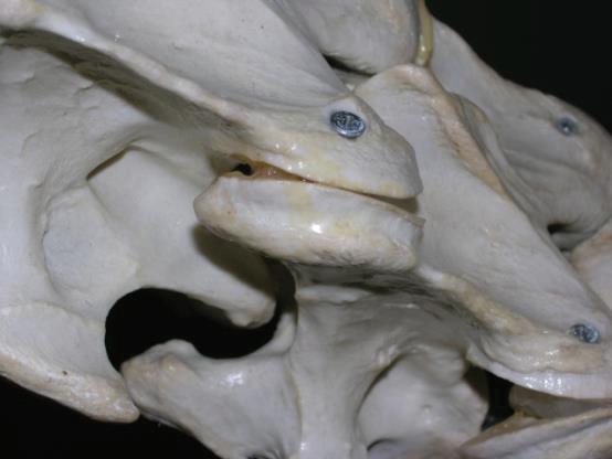 Fig. 3 Oblique thoracic image of a 16.2 hand Warmblood, 84 KVP/.18 sec generator, demonstrating marked, multifocal, ventral spondylosis. Such lesions associated with stiffness and poor performance, in the author’s experience