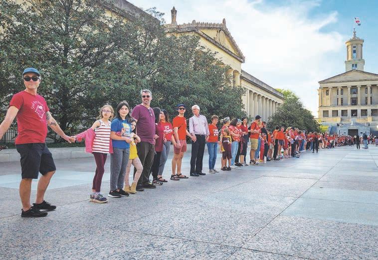 Gun reform protesters held hands to form a three-mile long human chain that stretched from Monroe Carell Jr. Children’s Hospital at Vanderbilt to the Capitol on April 18, 2023. PHOTO BY KELSEY BEYELER