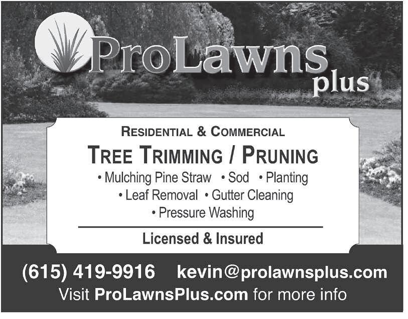 Need Prayer? If you are in need of prayer, call 888-388-2683 The Billy Graham Evangelistic Association will have prayer partners available to talk with you 24/7. PRAyER mt. Juliet Plumbing and Leak Detection “Beariffic Plumbing Repair Service!” Local Licensed experienced Plumbers (615) 733-5665 Carter Plumbing Commercial & Residential New Installation & Repair Service Drain Cleaning Service Licensed, Bonded & Insured All Work Guaranteed! (615) 232-9051 PLumBiNG i HAuL ANyTHiNG - since 1990Deliveries, Estate Property Clean Outs, Brush & Appliance Removal, Construction Waste, Demolition & more... No Job Too Small! Wyatt mallonee (615) 499-2218 moviNG/HAuLiNG Green Hills Lock & key Servicing the area since 1974! Deadbolts Installed Locks Re-keyed • Lockouts Locks Repaired & Serviced (615) 269-3616 LoCksmiTH JuNk HAuLiNG & DEmoLiTioN Junk Hauling •Appliances •Yard Waste •Household Items •Construction Debris Demolition Full or Partial Removal •Houses •Sheds •Carports •Buildings (615) 885-1736 JuNk REmovAL Complete Home Repair & improvements Native Nashvillian in business since 1992. Additions, Decks, Window Replacement, Furniture and Playground Equipment Assembly. All Types of Repairs. Licensed, Bonded, Insured Call Bob (615) 300-5558 Goodfred Window Cleaning Gutter Cleaning Gutters • Downspouts Cleaned Debris Removal • Gutter Guards Gutter Repair (615) 382-5127 GuTTERs Hardwood floors, cleaned, waxed, buffed, sanded and/or refinished. Over 75 years in flooring. Corlew & Perry, inc. (615) 832-0320 FLooRiNG LANDsCAPE LAND CLEARiNG Need a Reverse mortgage Call your LOCAL Reverse Mortgage Expert, Christine Clark. Access cash, payoff mortgage, or use however you like. Call 615-218-0543 P3 Home Loans, License #171878 FiNANCiAL svCs. ELECTRiCiAN Priced Right! New Work, Old Work and Service Calls. 10% senior discount. Licensed-Bonded-Insured (615) 522-1339 BBB Accredited with Reviews ELECTRiCAL svCs. P & T Concrete Driveways - Sidewalks - Patios Landscaping, Mulch and Bobcat Work. Free Estimates Richard’s Cell: 1 (615) 670-2273 (615) 755-3509 CoNCRETE/mAsoNRy (615) 298-1500 (615) 298-1500 CLASSIFIED Land C Clearing 615-419-0553 Ramlandclearing.com • Extreme Yard Cleaning • Rock Driveway Service • Forestry, Mulching Service • Stump Extraction • Bush Hogging THE REMODELING SPECIALISTS 3 7 Y e ar s o of R Re mo de li ng E xpe r ie nc e For All Of Your Home Renovation Needs www.broderickbuilders.com 615.385.3210 • Extensive reference list • Licensed & Insured 42 Years of Remodeling Experience INTERIOR • EXTERIOR • PRESSURE WASHING FINISH CARPENTRY • DRYWALL REPAIR TRIM REPAIR • CEILING DOCTOR Excellent local references FREE ESTIMATES Michael Ferrera 615-308-0211 Michael Ferrera 615-308-0211 Trees Trimmed / Removed Stump Removal, Great Clean-up Senior & Single Parent Discount Licensed & Insured, Free Estimates All Major Credit Cards Accepted 615-456-9824 www.gisttreeservice.com 24/7 EMERGENCY SERVICE HAZARDOUS WORK Wood Tree service formerly Gist Tree Service WE BUY RECORDS 45ʼS, 78ʼS, LPʼS Donʼt “give them away” at a yard sale. Any Size Collection No Problem. Also Buying Old Windup Phonographs Call Paul 615-953-7388 Paying TOP DOLLAR Over 45 Years WE BUY RECORDS 45’S, 78’S, LP’S Donʼt “give them away” at a yard sale Any Size Collection No Problem Also Buying Old Windup Phonographs Call Paul 615-953-7388 Paying TOP DOLLAR Over 45 Years Liner ad example Display ad example W E B U Y R E C O R D S 45’S, 78’S, LP’S Donʼt “give them away” at a yard sale Any Size Collection No Problem Also Buying Old Windup Phonographs Call Paul 615-953-7388 Paying TOP DOLLAR Over 45 Years LAND CLEARiNG LANDsCAPE Get Results, Advertise Your Business in the News! $10 for the first 15 words, .30 cents each word extra. Call 615-298-1500 to place an ad Advertising in The News Gets Results Call 615-298-1500 PAiNTiNG/PAPERiNG HomE imPRovEmENT TREE sERviCE