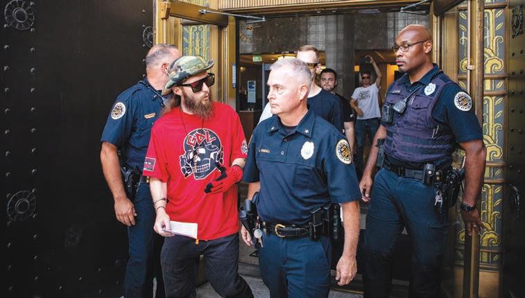 A neo-Nazi being escorted out of city hall, July 16, 2024