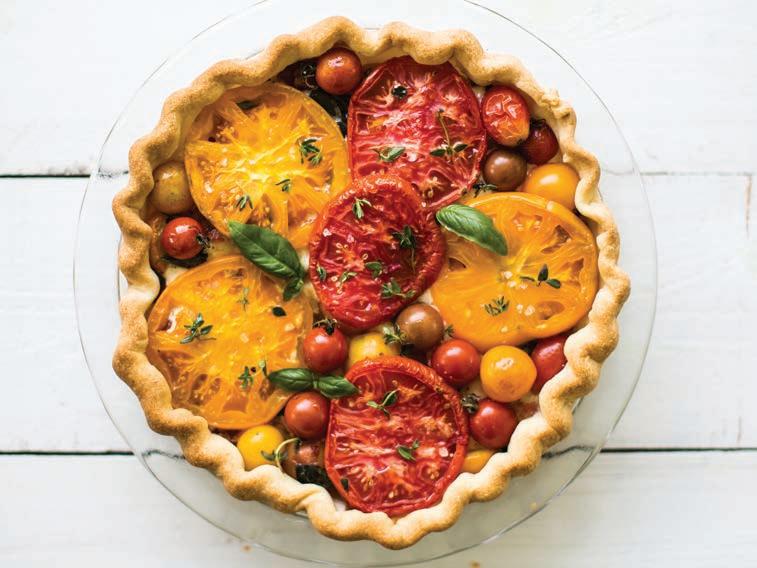 of the basil leaves, and spread half of the mayonnaise mixture over the basil. Repeat, ending with a final layer of sliced tomatoes, placed so that you can fit the cherry tomatoes on top as well. Scatter thyme leaves on the top of pie.