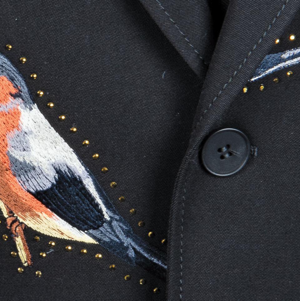 This Stella McCartney-designed jacket, embellished with rhinestones and embroidered birds, was worn by Rosanne Cash during her performance at the 2018 Americana Honors & Awards in Nashville, where she received the Spirit of Americana Free Speech Award.