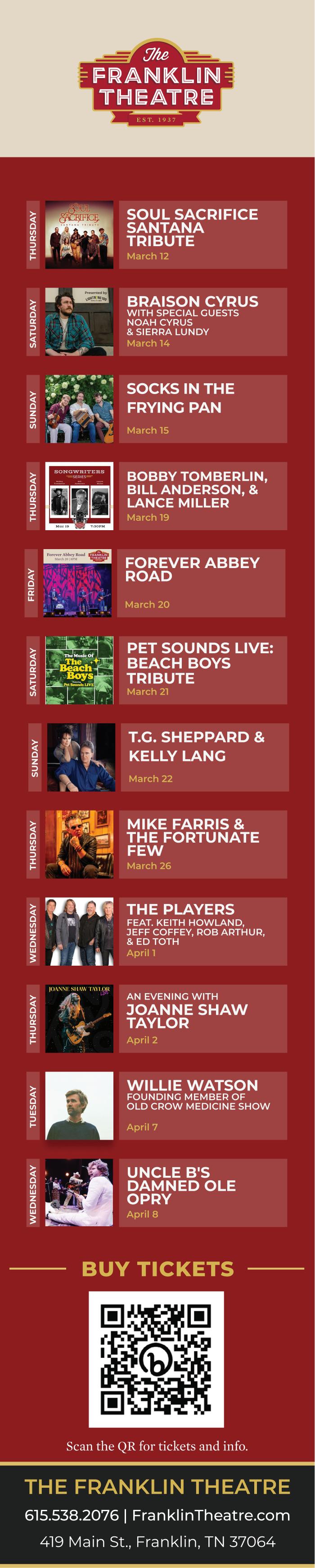 THE POWER OF THE PURSE Step into a celebration of generosity at Power of the Purse on April 16 at OZ Arts. Enjoy an evening benefiting the Women’s Fund at the Community Foundation of Middle Tennessee, featuring auction items and an experience. Visit cfmt.org/ calendar-events for tickets