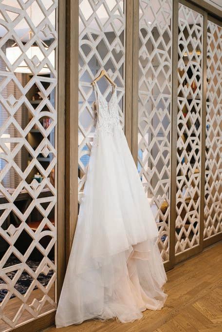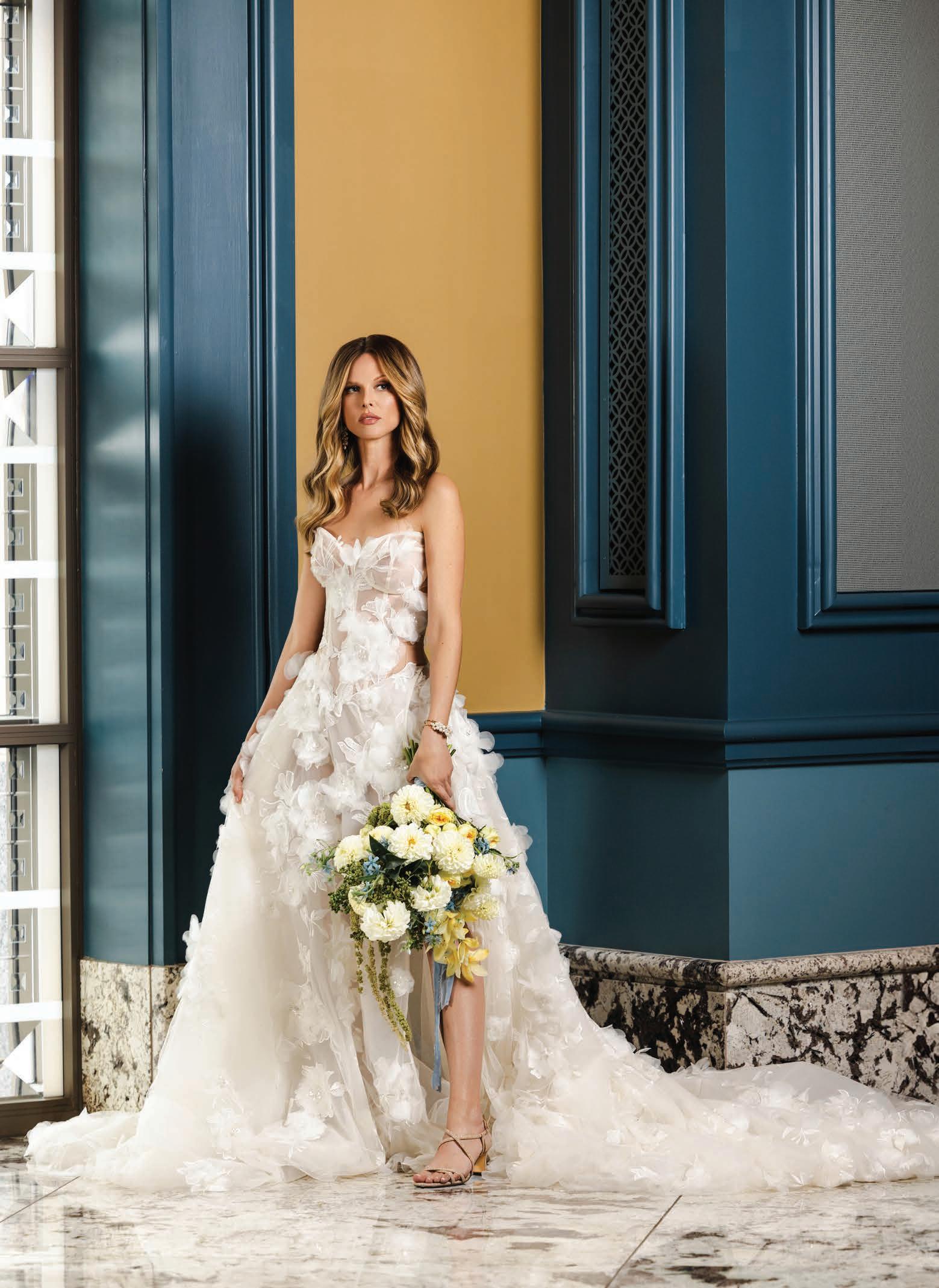 Scarlett Burke of AMAX Talent in a SAINT Bridal Couture gown from Dress Theory. Photographed on location at The Fisher Center for the Performing Arts by Tausha Dickinson. For more bridal fashion, turn to page 21.