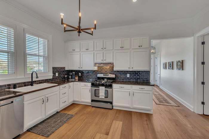 Designed by Kevin Coffey and built by Alan Looney of Castle Contractors, this custom home was inspired by the owners’ love of Tuscan architecture and the casual comfort of a coastal home. The winding drive through a stand of pine trees adds a serene sense of arrival and the quintessential setting for this dreamy home. While there is a contemporary open feeling throughout the public areas of the house, a series of tall arches define the space into separate rooms and functions. The home oozes with simple elegance featuring high beamed ceilings, three woodburning fireplaces, wide plank wood floors and walls of windows for abundant natural light. A large island defines the kitchen and prep pantry which was specifically designed for the owner who is a true foodie/chef. The stunning European breezeway leads to the four bay garage and the outdoor kitchen. This home offers functionality and flexibility for whatever your hobbies, interests and lifestyle may require, while the rare 2.15 acre deep, wide and level yard is perfect for the buyer to customize to their specific needs. Perfect for a pool, sports and entertaining areas. The primary bedroom wing is on the main floor with two/three additional bedrooms up, the home was thoughtfully designed with expansion space and plumbed to easily add a 5th bedroom suite upstairs The detached space over the garage which is currently the owners private office, can be expanded to create a spacious “mother in law” apartment or guest quarters with its own private entrance.