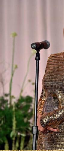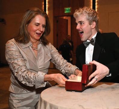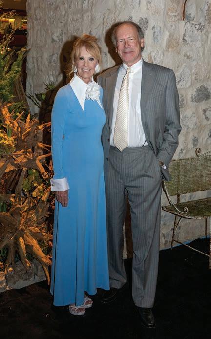 Exotic hues and textures included velvet cloths in shades of desert sand topped with delicate white blooms — baby’s breath, jasmine, eucalyptus and lunaria. (You might recognize lunaria as the “silver dollar plant.”) Grecian chairs were upholstered in dreamy pale oceanblue velvet. The vessels that held the centerpieces looked like breezeblown linen, treated with a stiffening essence that could support the airy blooms, all inspired by Melissa Broadwell of Vintage Florals. Roving troubadour Miles Aubrey played acoustic guitar during cocktails, while guests perused the silent auction options. Sporting a leather cowboy hat and long black coat, Miles shifted to riveting electric riffs to open dinner.