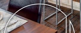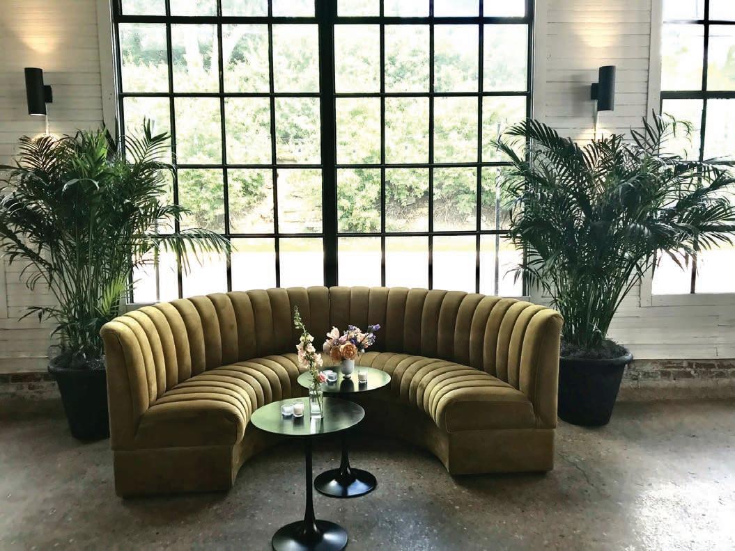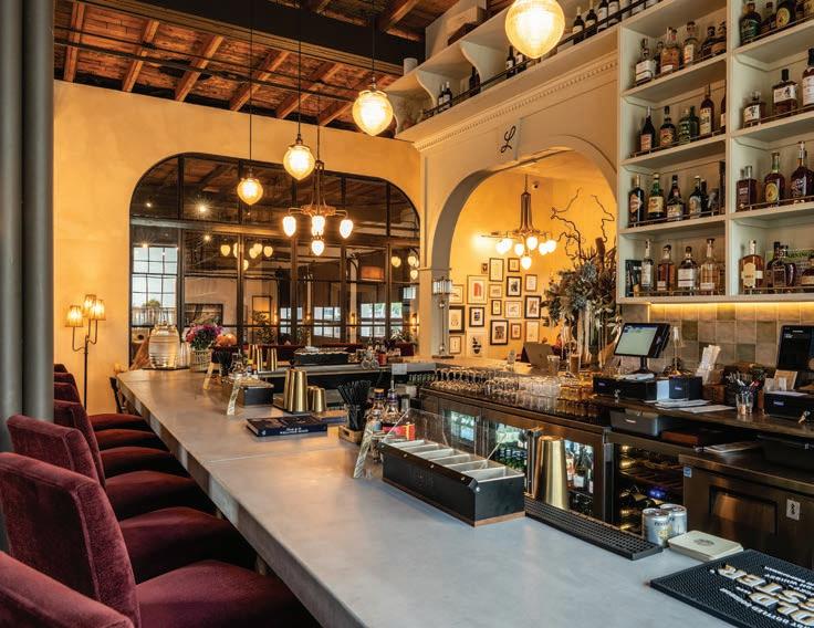 In keeping with the “collected” theme, Joe drove four hours to Kentucky to purchase two church pews for $100. Tweaked, painted and distressed, they work perfectly as banquettes amid the original concrete floors and exposed brick. General manager Josh Gri n “mixed stains and paint” to distress the plaster on the walls and repurpose furniture, achieving a “perfectly imperfect” look.