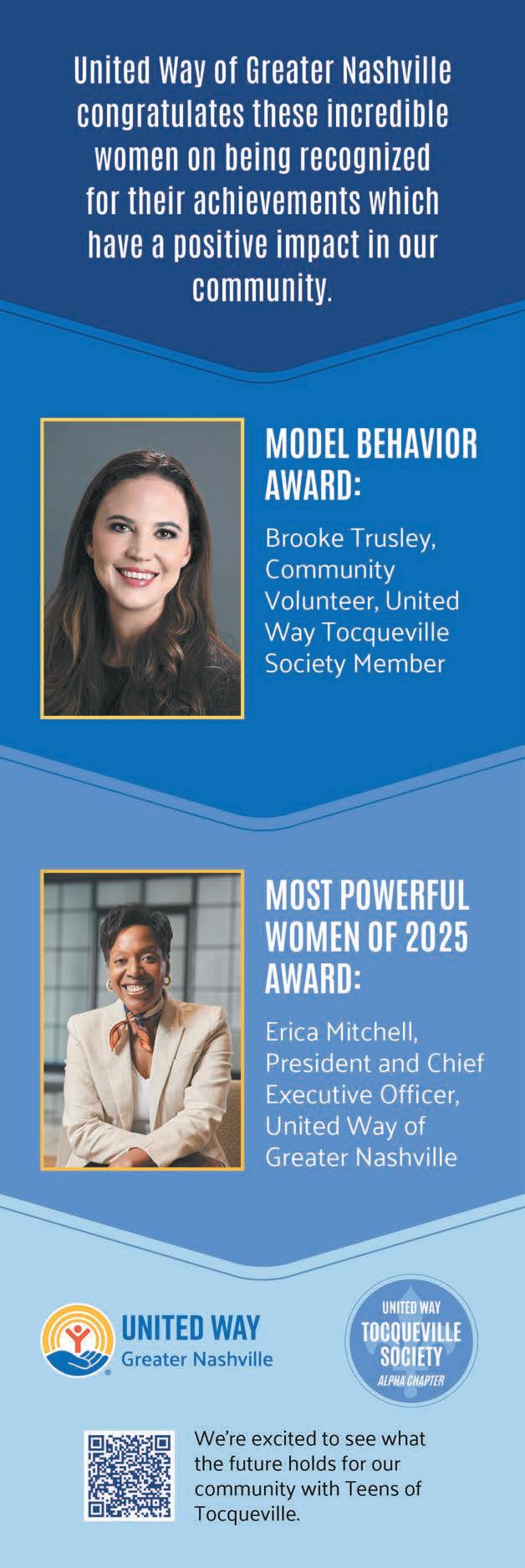 In this issue, we celebrate 10 remarkable Nashvillians whose generosity, drive and vision have earned them a place in our annual Model Behavior feature. We also honor another extraordinary group — the Most Powerful Women, as profiled by Nicolle Praino, Julianne Akers and Hannah Herner for our sister publication Nashville Post. These leaders are reshaping industries, opening doors for others and proving what’s possible when talent meets dedication.