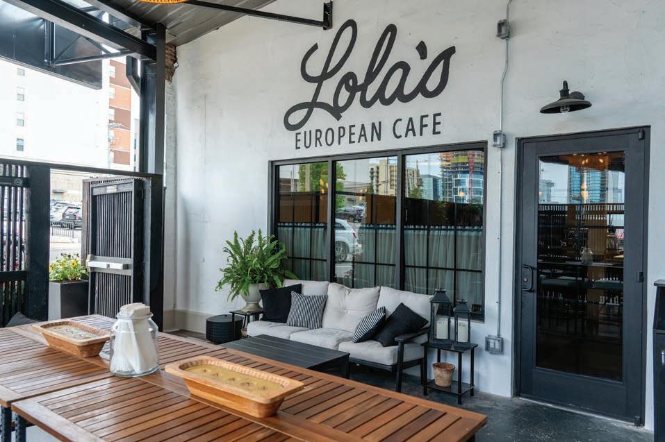 AS GUESTS ENTER the newly opened Lola’s European Cafe, housed in an unassuming white-brick building in Midtown, they’ll find a master class in eclectic design. The foyer floor is done in black-and-white penny tile with a cursive "L" in the center. A large arrangement of dried wildflowers on a marble-top table sits next to vintage windowpanes and charcoal gray wainscoting. A whimsical white scooter stands in the corner.
