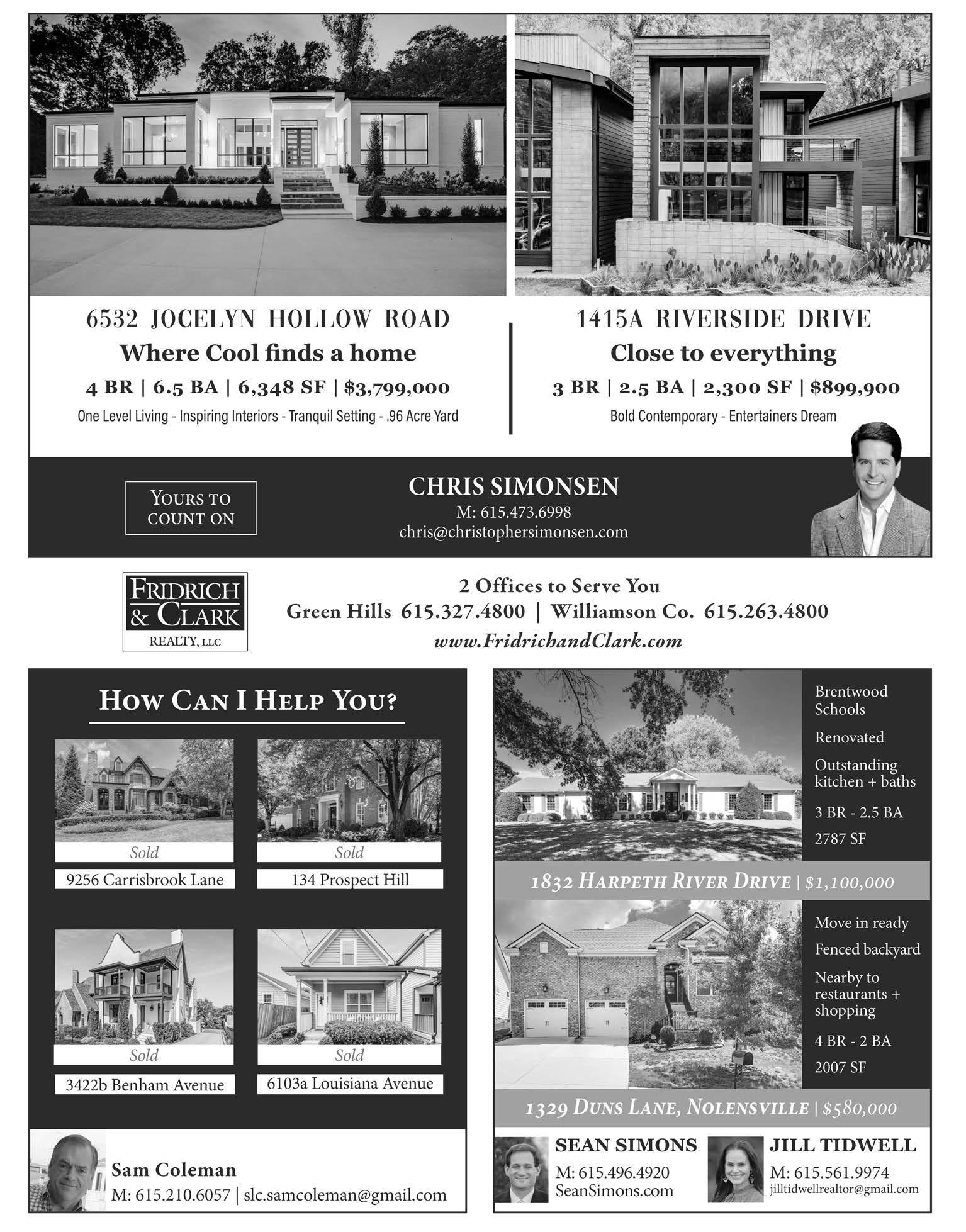 1209 Otter Creek Road- Forest Hills 6 Beds | 6/2 Baths | 8,135 SF | $4,980,000 5404 Sassafrass Place - Forest Hills 5 Beds | 6/1 Baths | 9,131 SF includes pool house Over 5 Acres | $3,195,000 | Saltwater Pool 102 Collinwood Close - Franklin/Temple Hills 4 Beds | 4 Baths | 3,034 SF | $755,000 6323 Chickering Woods - Nashville 3 Beds | 2/1 Baths | 3,261 SF | $945,000 165 Front St. - Franklin/Westhaven 4 Beds | 4 Baths | 3,313 SF | $1,875,000 1370 Deal Rd. - Burns, TN 4 Beds | 2 Baths | 2,190 SF | 5.74 Acres - $484,000 876 Van Leer Drive - Oak Hill 5 Beds | 5/1 Baths | 6,418 SF | $3,490,000 1374 Deal Rd. - Burns, TN 7.18 Acres - $125,000 Egypt Rd Lot 4 - Chapel Hill 7.26 Acres - $240,000 937 Woodmont Blvd. Green Hills 4 Beds | 3/2 Baths 3,168 SF | $1,395,000 Smiley Rd Lot 4 - Chapel Hill 5.01 Acres - $225,000 Smiley Rd Lot 5 11.82 Acres - $535,000 Office: 615.327.4800 | Mobile: 615.533.8353 richardfbryan@gmail.com Richard Bryan