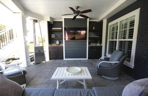 Shielded from the elements and outfitted with comfortable furnishings, a wet bar, and a mounted flat screen television, this space offers an oasis for watching movies, sports or binging your favorite shows with family and friends.