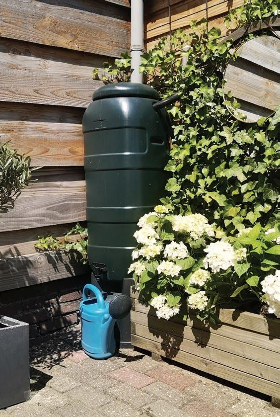 Instead of a rain barrel, create a simple collection system by placing any recycled, water-tight container directly under a downspout. Buckets, trash cans and large pots make for easy collection containers.