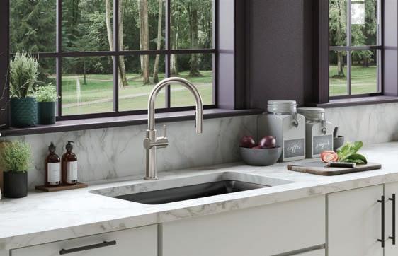 Or consider the Crue touchless pull-down sink faucet with a three-function sprayhead. The Crue faucet collection represents a true high point in user-focused, sophisticated plumbing design. The contemporary silhouette - a simple arched spout and single lever handle - offers a straightforward style that adapts to nearly any room design, and the touchless functionality makes tasks simpler.
