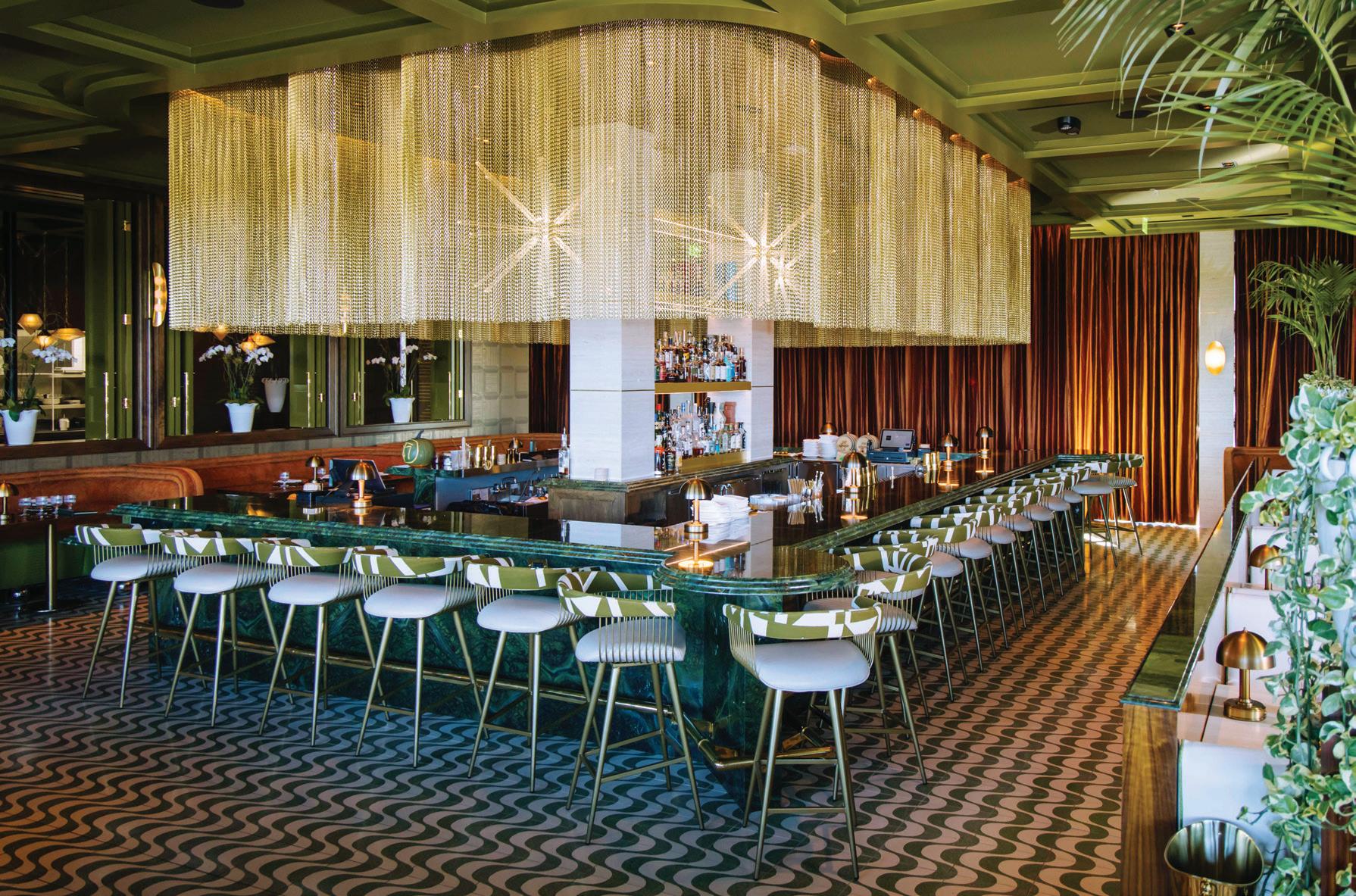 Paris where he socialized with fellow expats, mostly writers and artists, in the 1920s, with a dark teal and black art deco stage and outdoor patio mimicking the true Bar Hemingway in Paris, complete with lit scotch decanters and a displayed marlin centered between Hemingway photos.