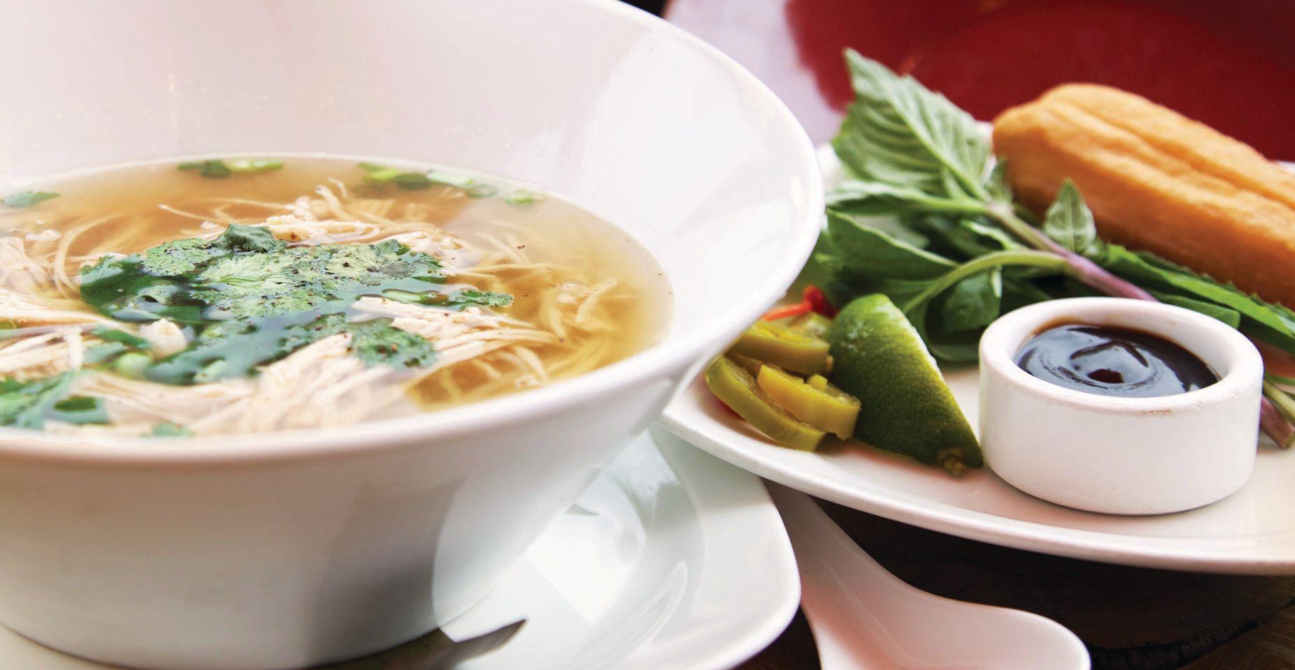 My Chicken Vietnamese Soup ($7 small, $10 large) arrived next. A small portion was twice as large as I expected. Tender pieces of chicken breast, thin rice noodles, bean sprouts and fresh herbs harmoniously swam in a perfectly spiced chicken broth. It’s a pick-up-the-bowl, slurp-thelast-drop kind of soup.