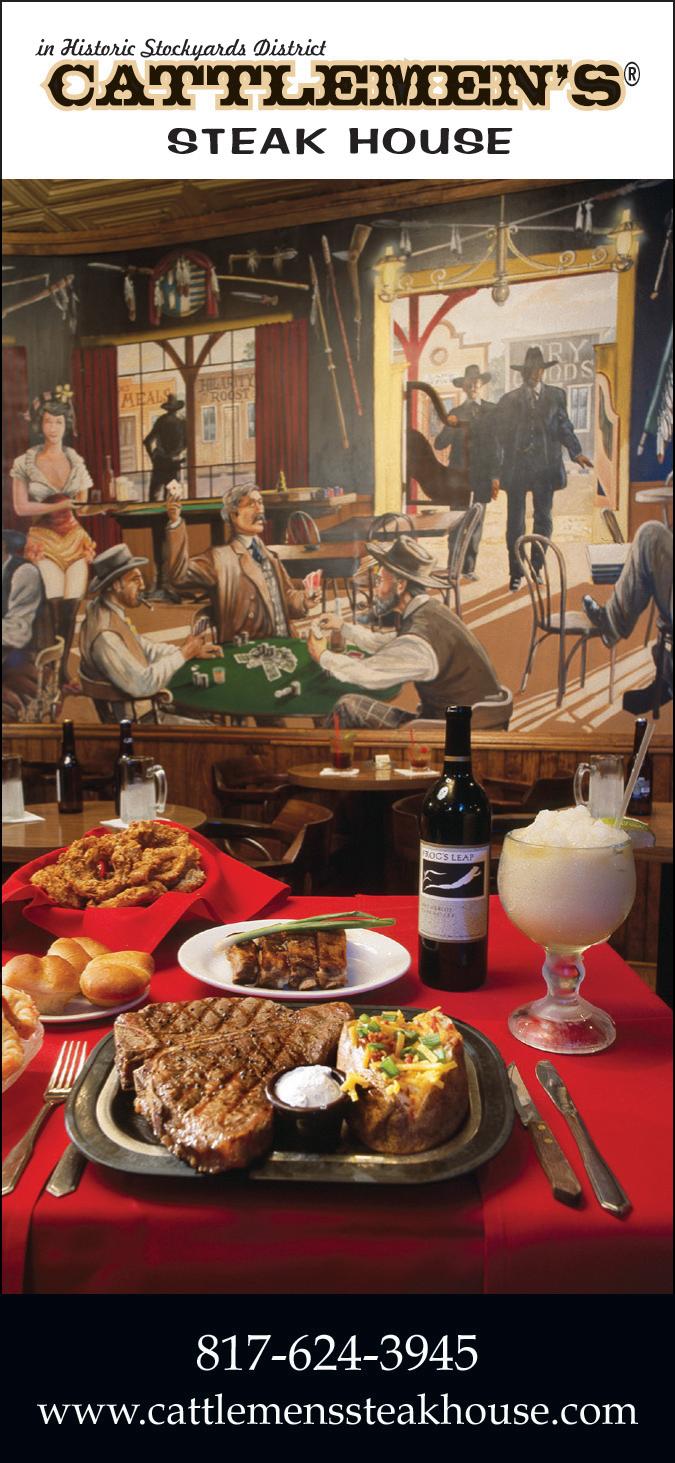 bOb’S STEAK AND CHOP HOUSE » 1300 Houston St., 817.350.4100. One of the top steak houses in the country, Bob’s Steak and Chop House, has come to Fort Worth and is located inside of the Omni Fort Worth Hotel. You’re sure to become a regular after experiencing their stellar service, extensive wine list and quality food in an upscale atmosphere. 5-10pm Mon.-Thu.; 5-11pm Fri. and Sat.; Closed Sun. $$$$ D T ( CATTLEMEN’S STEAK HOUSE » 2458 N. Main St., 817.624.3945. In the Stockyards since 1947, Cattlemen’s is a beef institution where you choose your steak from the glass butcher case. If you’re not a red-meat eater, there is a good selection of superb seafood and chicken. 11am-10:30pm Mon.-Thu.; 11am-11pm Fri.-Sat.; 1pm-9pm Sun.