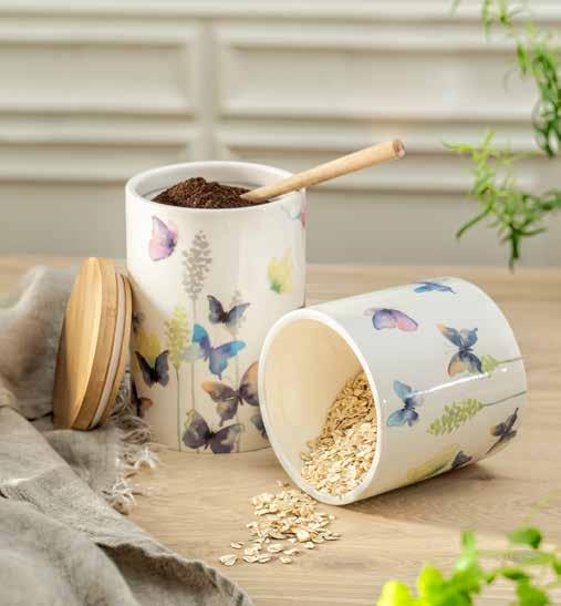Näyttävä ja käytännöllinen posliinista valmistettu säilytyspurkki ilmatiiviillä bambukannella. Säilytyspurkkia koristaa taiteilija Cecilia Åbergin suunnittelema upea perhosaihe, jossa hennot perhoset tanssivat valkoisella maasälpäposliinilla ja vievät ajatukset vuodenajasta riippumatta kauniisiin kesäpäiviin. Säilytyspurkki on erinomainen monien elintarvikkeiden säilyttämiseen, samalla kun se toimii näyttävänä sisustuselementtinä.