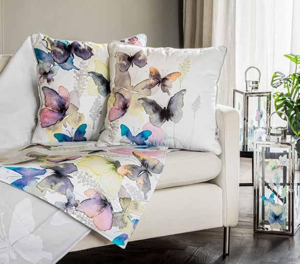Koristele sohva tai nojatuoli ihastuttavan sävyisillä perhosilla. Muotoilija Cecilia Åberg on hyödyntänyt akvarellien eloisuutta maalatessaan tyynyjen kuva-aiheiksi helmihyasintteja, hajuherneitä ja hentoja perhosia. Puuvillasatiinista valmistettu torkkupeitto on täytetty polyesterikuidulla, joka tekee peitosta ihanan pehmeän ja viileän tuntuisen ihoa vasten. Lyhtyjen unenomaiset kuva-aiheet, perhoset ja kukat väreineen heräävät eloon, kun sytytät kiiltävät rosterilyhdyt iltahämärässä.