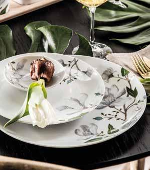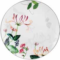 I en naturlig fargeskala og med et moderne formspråk i både dekor og form, gir Clematis følelsen av en frodig hage med stolte klematisblomster som slynger seg over porselenet.