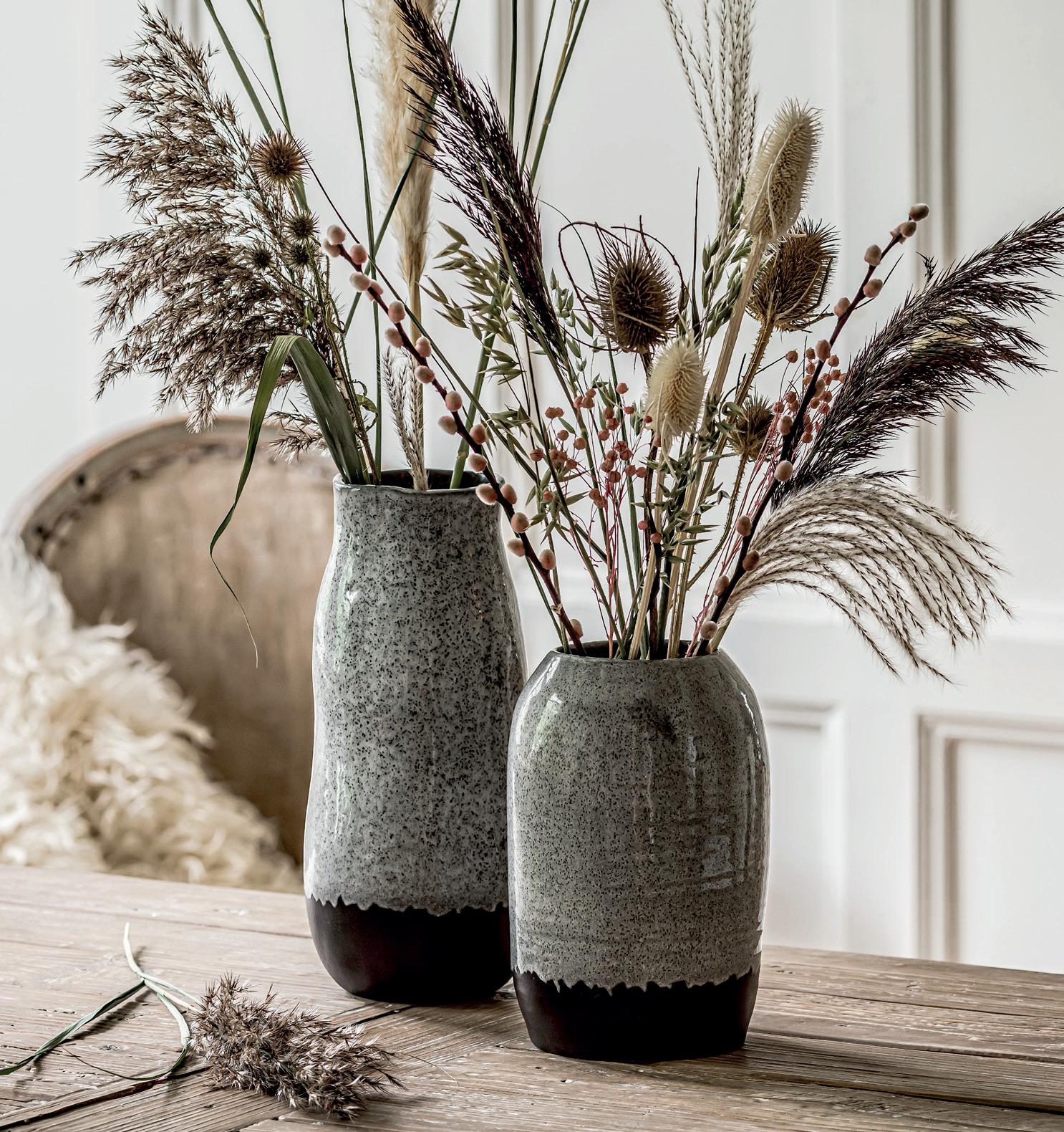 Vasene er som øvrige deler i serien fremstilt av stengods i Portugal. Glasuren er laget for hånd, noe som skaper spennende variasjoner i glasuren og gir hver vase et unikt preg. Vasene er like fine i all sin enkelhet som med en bukett blomster eller tørkede strå. 22 og 30 cm | gråsvart eller beigebrun 895 kr/995 kr (10013115/3116/3117/3118)