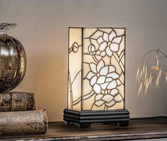 Inred ditt hem med en vacker fönsterlampa i traditionell tiffanystil. Ställ den i fönstret och låt den sprida ett trivsamt och mysigt sken i ditt hem under en lång tid framöver. Lampan har en enkel design med ett komplext mönster, tillverkat av många små vita- och champagnefärgade glasbitar som tillsammans formar ett romantiskt blomstermönster.