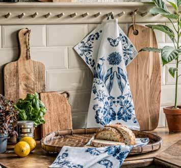 Tidlös kökshandduk med ett härligt tryckt blomstermönster av Micael Bindefeld. Vackra mörkblå fjärilar, jätterams, akleja och förgätmigej täcker den vita kökshandduken och bildar ett klassiskt blåvitt motiv som alltid kommer kännas aktuellt.
