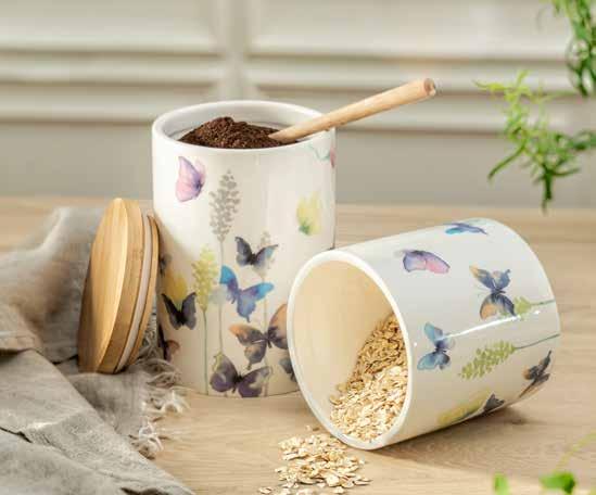 Söt och smart förvaringsburk i porslin med tätslutande lock i bambu. Cecilia Åberg har designat det ljuvliga motivet. Burken blir en smakfull detalj i hemmet som samtidigt bevarar innehållet på bästa sätt. Brickan är tillverkad i Sverige av formpressad björkfanér av högsta kvalitet och fjärilsmotivet är förseglat med melamin vilket ger extra tålighet.