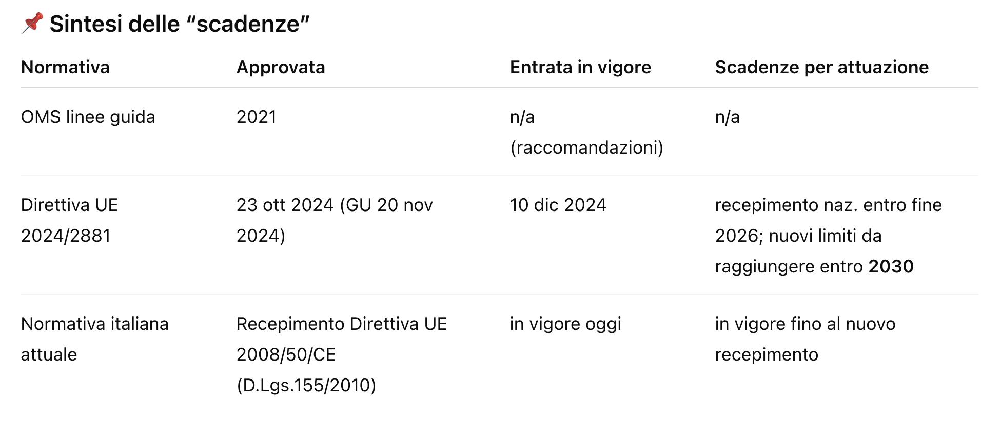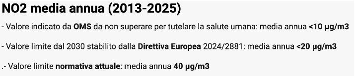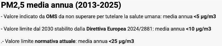 Il progetto nazionale “CAMBIAMO ARIA. Salute e inquinamento atmosferico nelle città italiane” ha analizzato in modo sistematico i dati ufficiali delle reti regionali di monitoraggio delle ARPA/APPA, confrontando le concentrazioni degli inquinanti con i limiti normativi attuali (D.Lgs.155/2010), con quelli più stringenti fissati dalla Direttiva europea n. 2881/2024, che entreranno in vigore dal gennaio 2030 e con i valori raccomandati dall’Organizzazione Mondiale della Sanità (Linee Guida 2021), con l’obiettivo di fornire uno strumento di conoscenza e di pressione civica a tutela della salute collettiva.