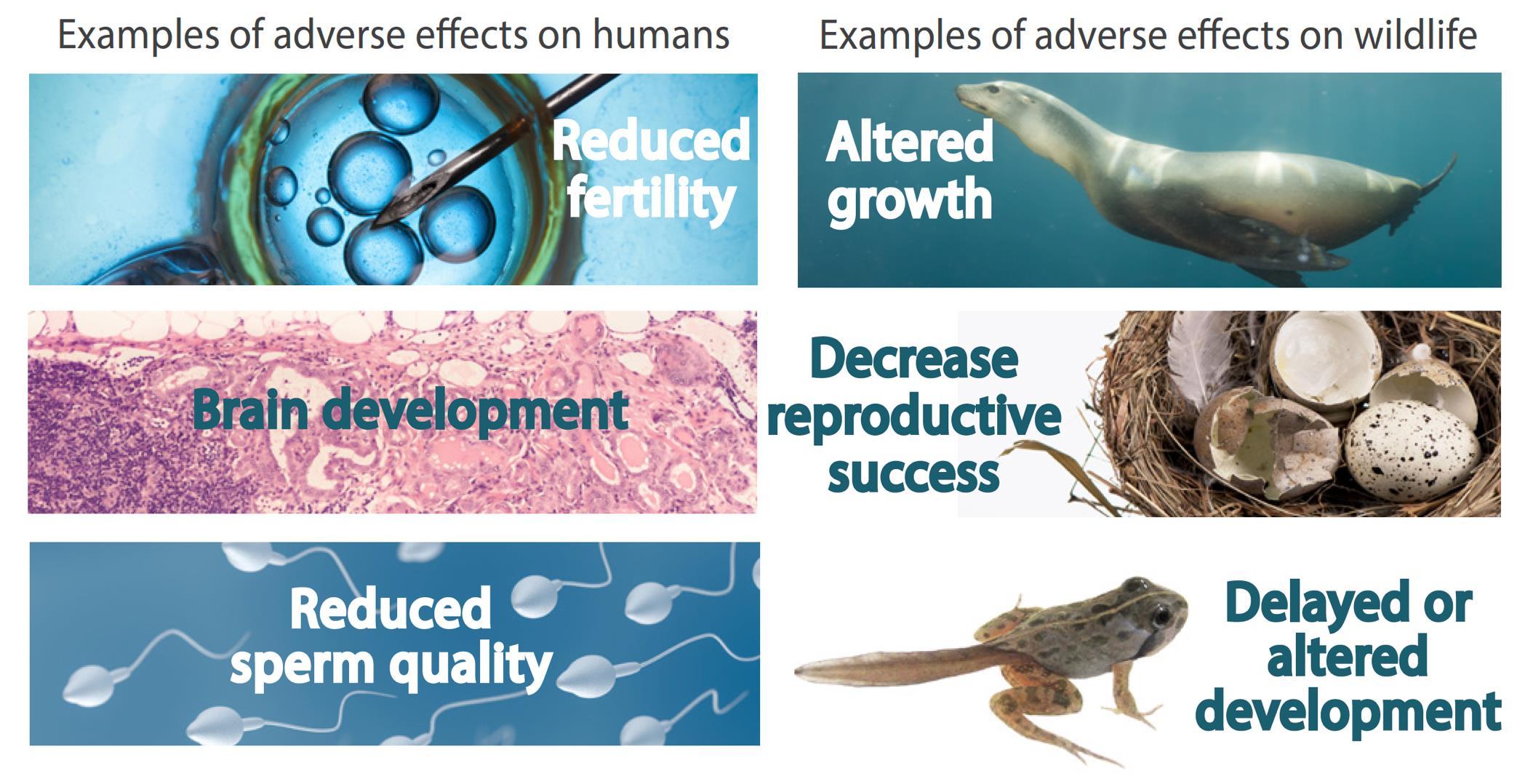 Research has established a link between some chemical exposures, effects on hormone levels, and altered physiological responses such as changes in growth, development, fertility, fecundity and lactation. In some cases, there may be a long timelapse between the chemical exposureand the manifestation of effects on the individual.