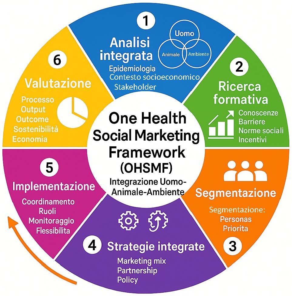 Da queste considerazioni nasce la proposta di un modello integrato per il cambiamento comportamentale che valorizza il Social Marketing nell’ambito della One Health: “One Health Social Marketing Framework” (OHSMF) che si articola in sei fasi interconnesse: