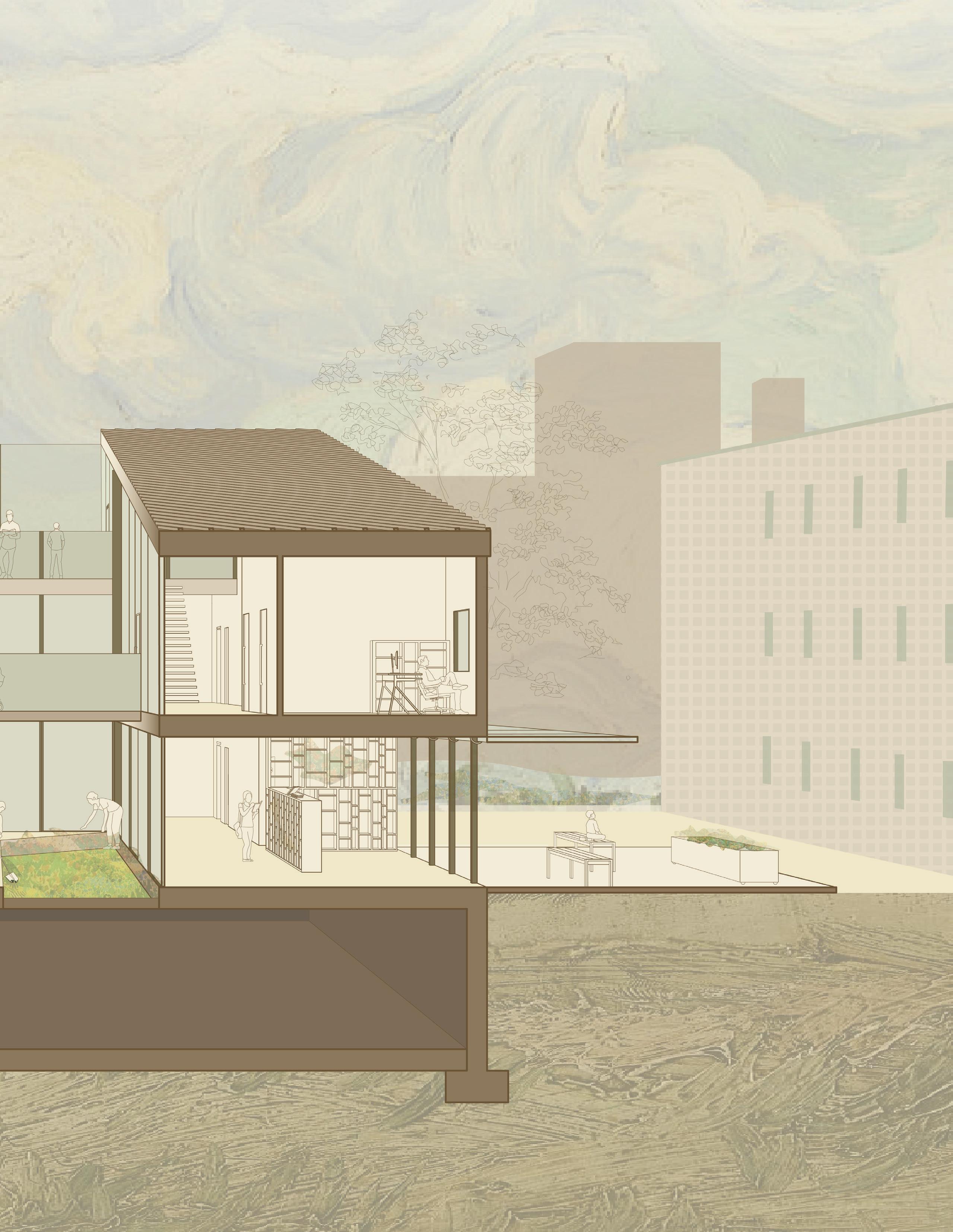 As an extention of the landscape, specifically the Joel Weeks Park, Persephone’s Garden is a library + garden and kitchen which supports local sustainable food production and businesses. Highlighting its central courtyard, Persephone’s Garden is simply an urban building with an outdoor space within.