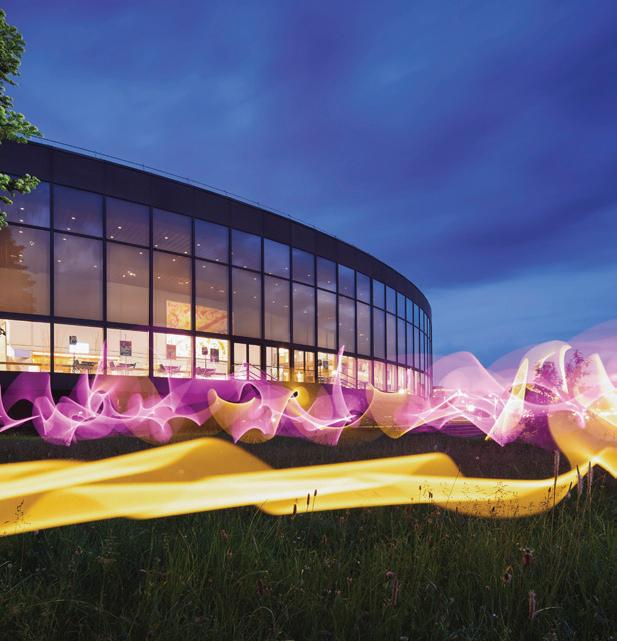 Eine umspannende Metallkonstruktion in Form einer Reifenspur ist das architektonische Ausrufezeichen des imposanten Bauwerkes.