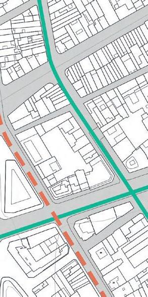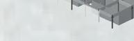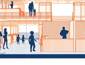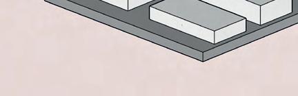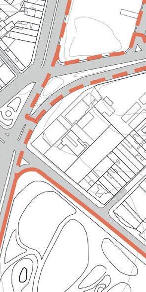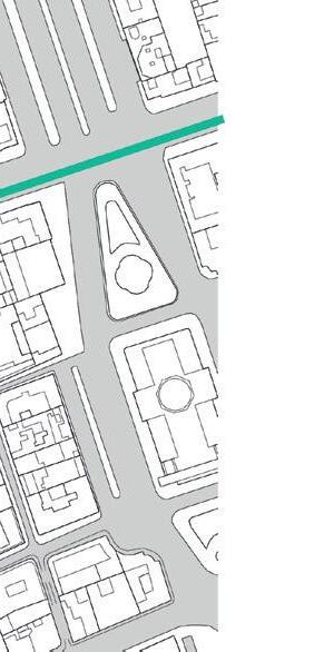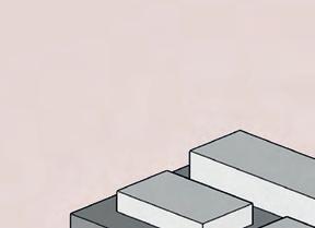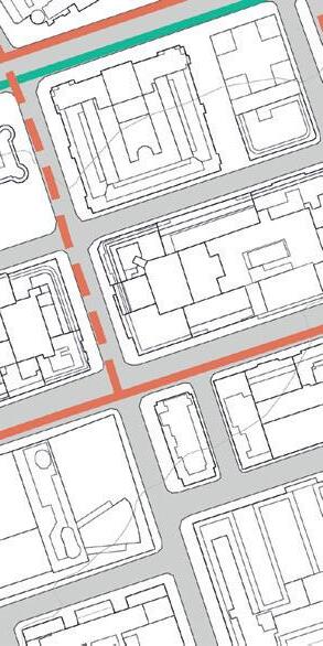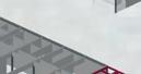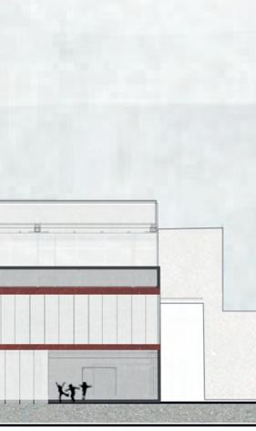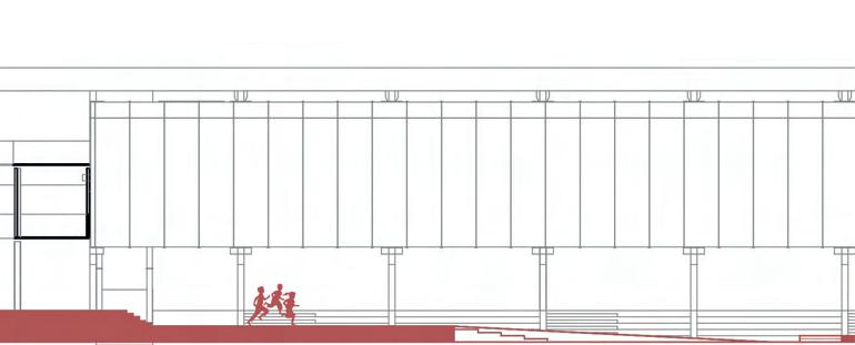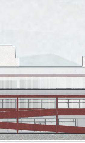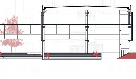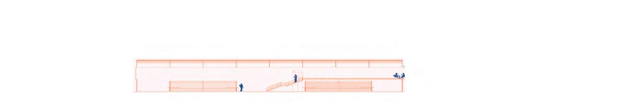 mezanino do mesmo elemento estrutural, formando um percurso ao longo dos blocos. O pavimento térreo é uma extensão do espaço público, integrando uma série de espaços abertos, enfatizando o conceito de es-
