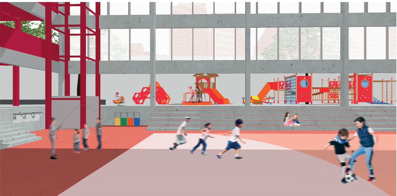 A área recreativa por sua vez, que contém o anfiteatro,a quadra poliesportiva e o pátio, foi toda rebaixada visando