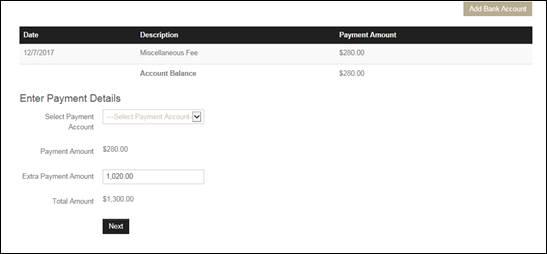 TheAccountBalancewillreflectatthetop;thisamountwillautomaticallybeincludedin thepayment.Findpastmonthlychargestodetermineamounttobebilledonthe28th andinputthisintheExtraPaymentAmountfield.ClickonNexttoprogressthrough processingthepayment.
