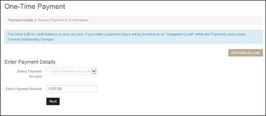 Uponlogin,thebalancereflecteddueis$0.Findpastmonthlychargestodetermine amounttobebilledonthe28thandinputthistotalintheExtraPaymentAmountfield. ClickonNexttoprogressthroughprocessingthepayment.