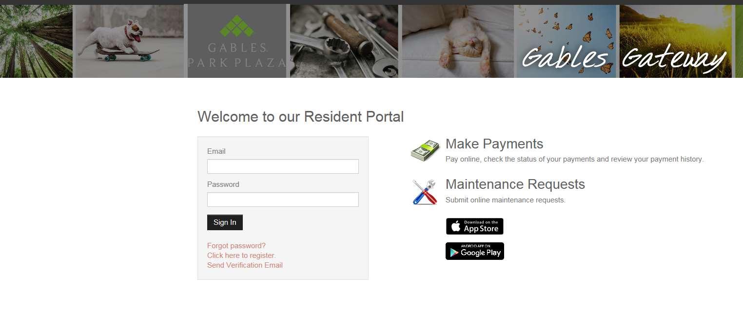 ThebelowimageisanexampleofwhattheGablesGateway,RentCaféportallookslike. ToaccessGablesGateway,RentCafégotowww.gables.com.Clickonthe“Resident”tab onthetoprightcorner.ScrollthroughandselectGablesParkPlaza,thenclick“Go”.