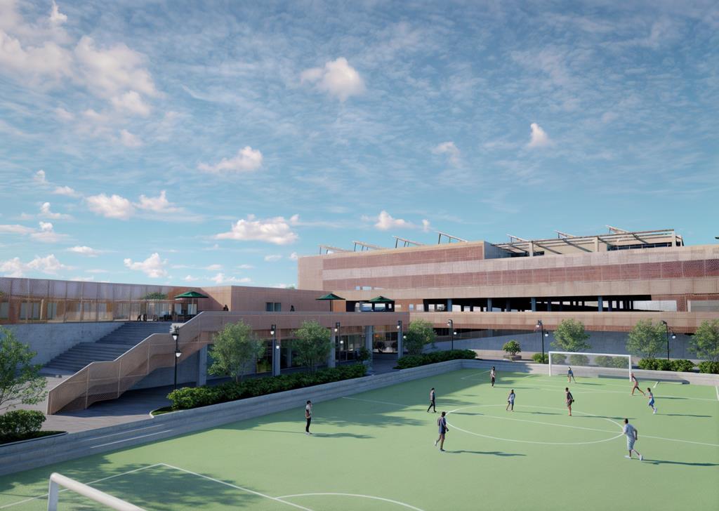 Este incorpora áreas verdes con instalaciones deportivas, tanto interiores como exteriores, supermercado, espacio de coworking, restaurante y espacio de parqueo en altura para aprovechar el espacio del terreno