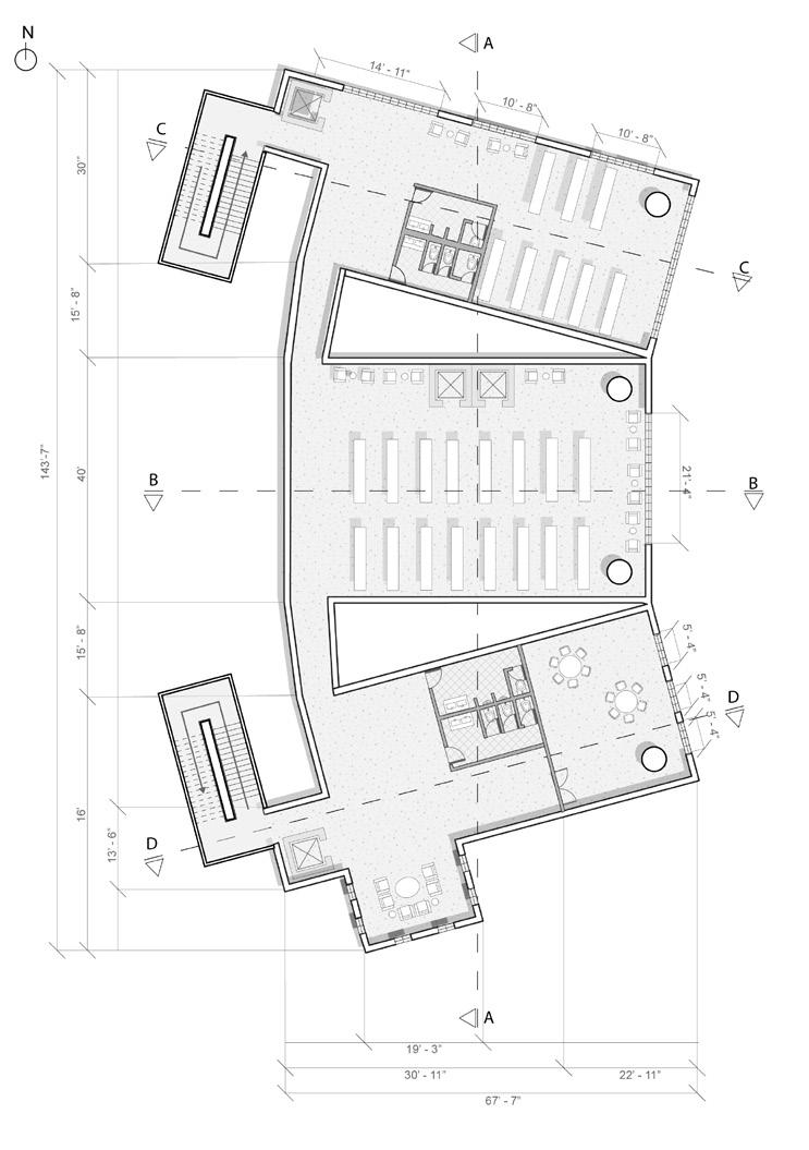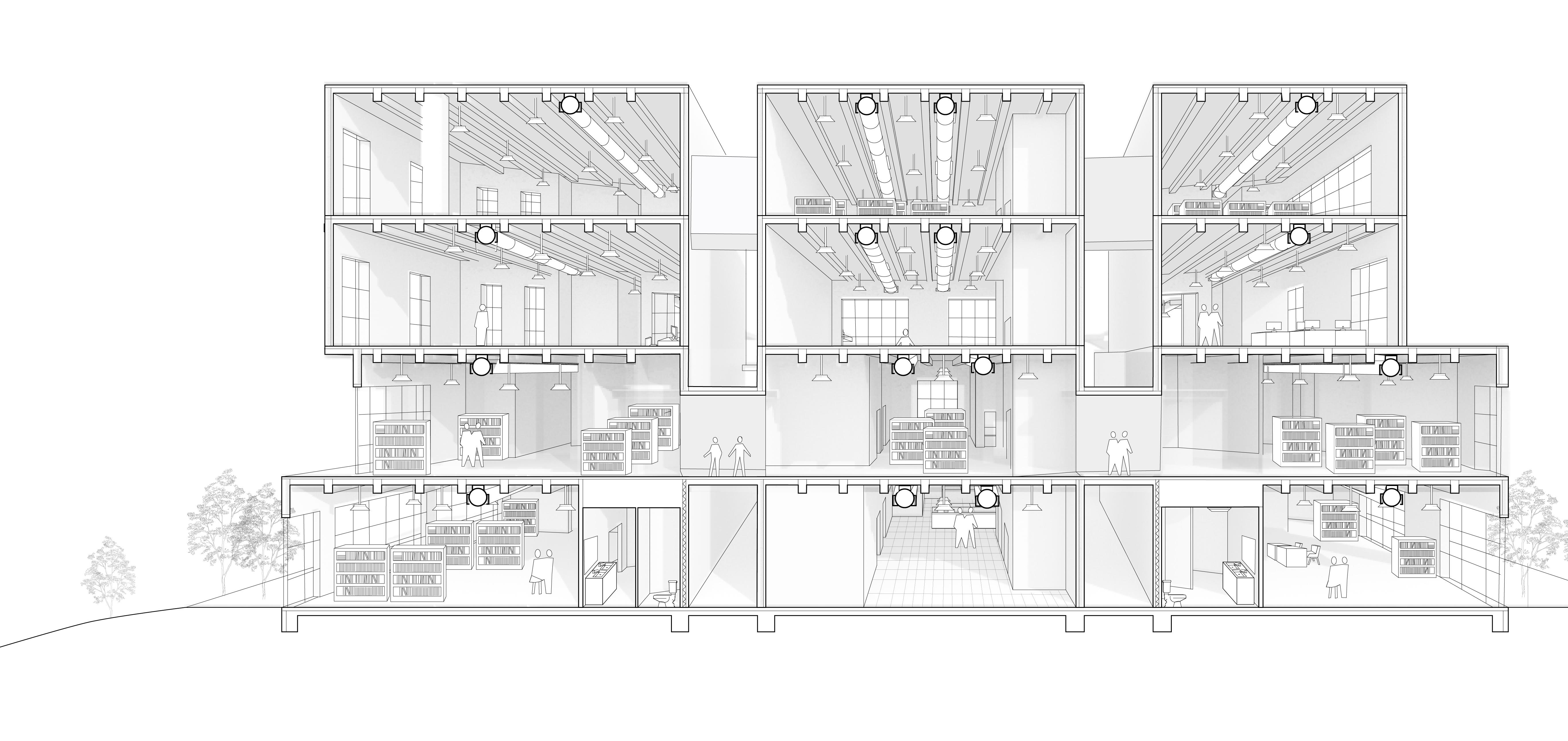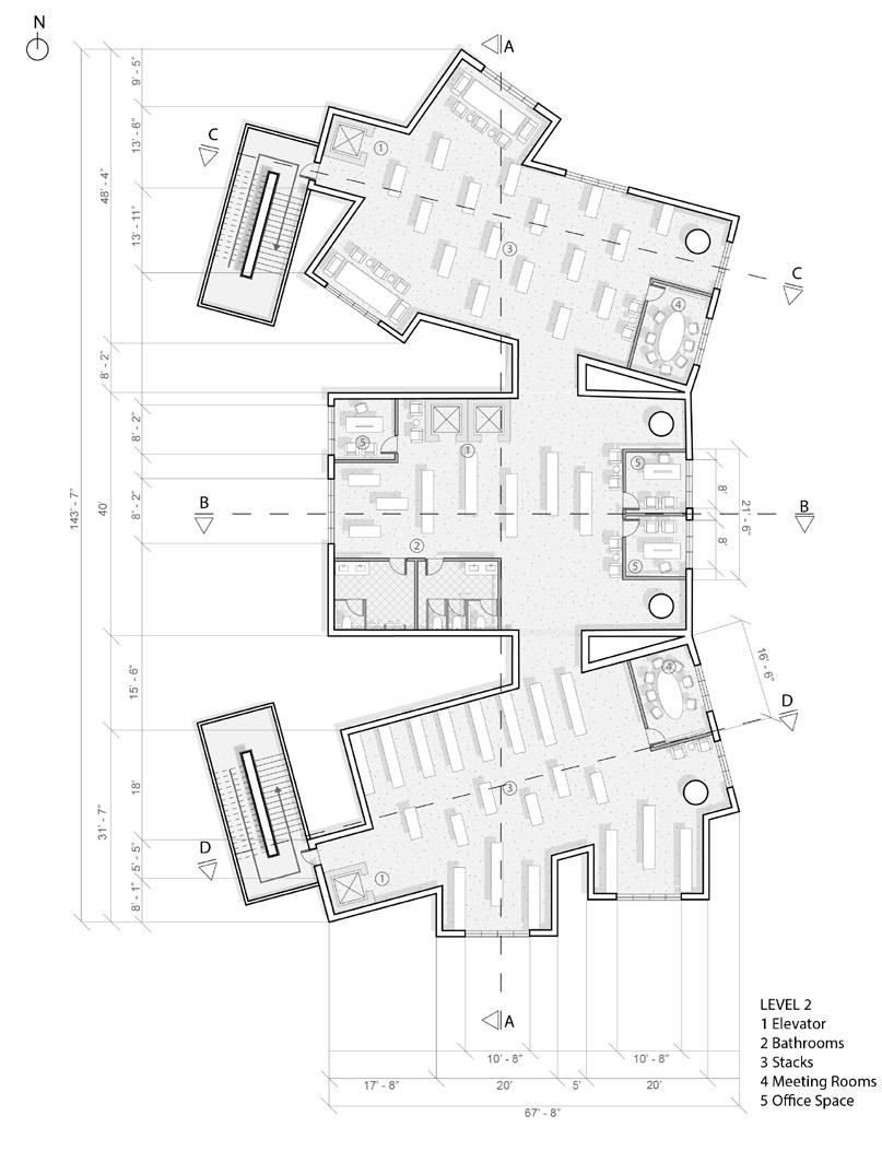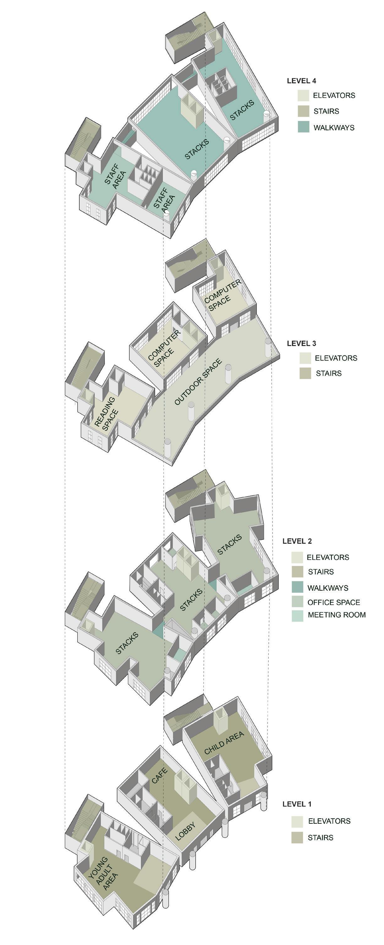 The library’s program is arranged along a vertical hierarchy of public access and privacy.