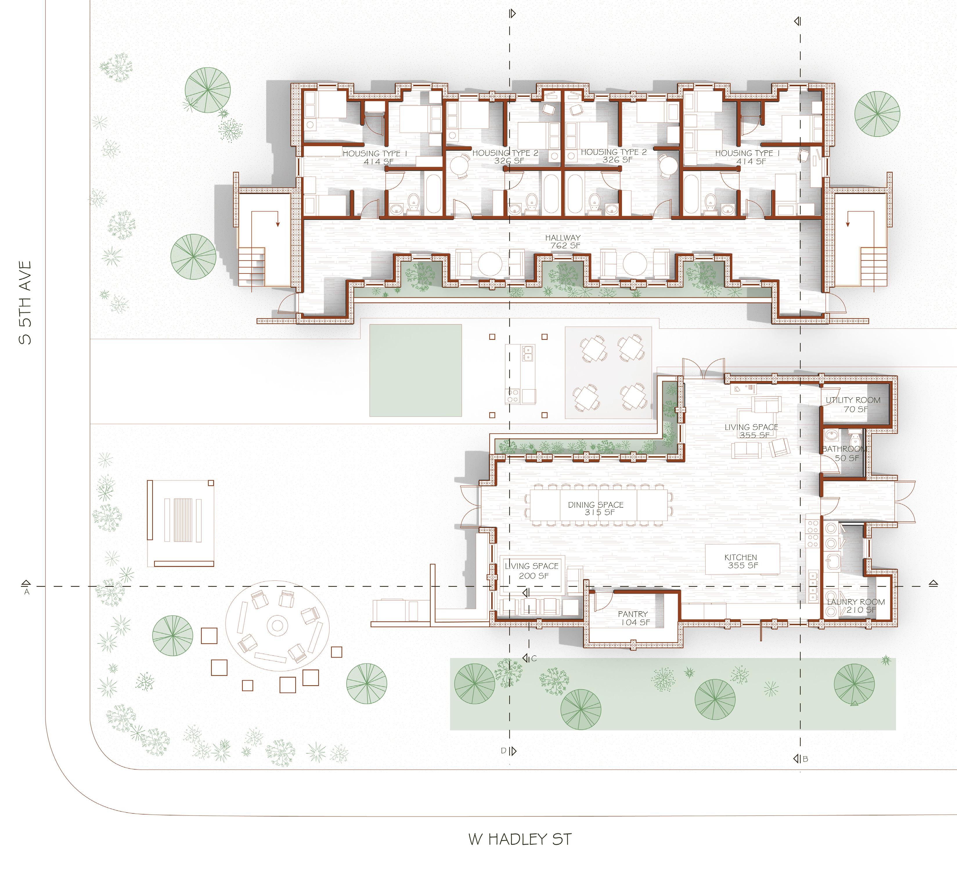 Co-Housing at Downtown Phoenix is a residential project designed to support single-parent households within the Grant Park neighborhood. Inspired by local and international co-housing precedents, the project prioritizes shared spaces that encourage community connection, mutual support, and resource sharing related to childcare, food security, and daily living.